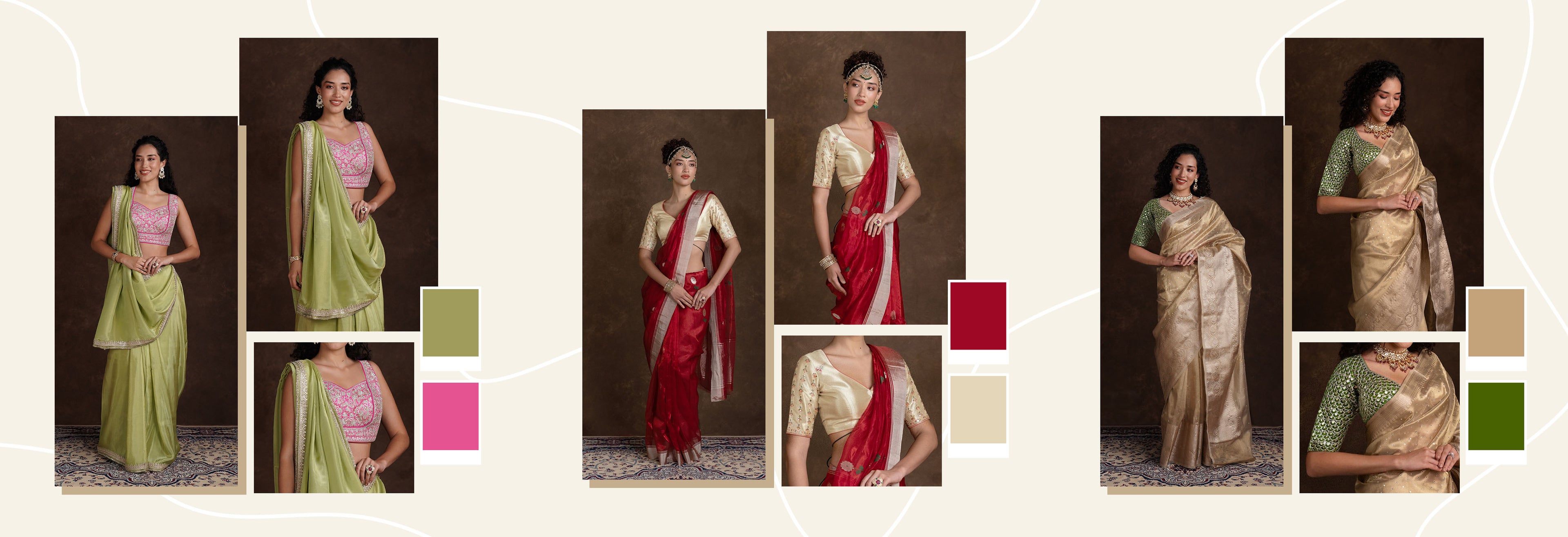 We have listed below the best and trending saree-blouse colour combinations for 2025, thoughtfully curated to suit every fabric, occasion, and mood.