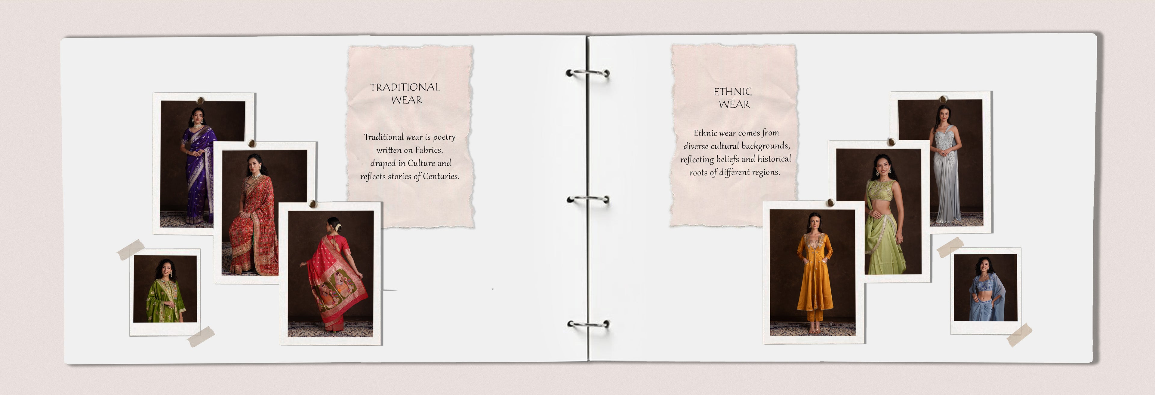 Traditional wear is deeply rooted in a community's history, customs, and values, paired in festivities and passed down to generations. These are the outfits that you wear for a festival, puja, ritual and ceremonies. Like a Bengali saree for Durga Pujo, a Nauvari saree for Ganpati or Gudi Parwa.