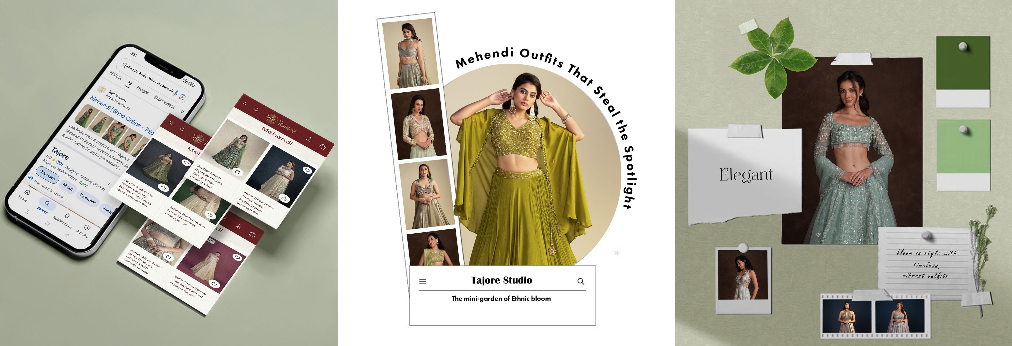 You can go through our website tajore.com to check a vast collection of mehendi outfits or visit our studio in Malad West for a personalised experience with our in-house stylist.