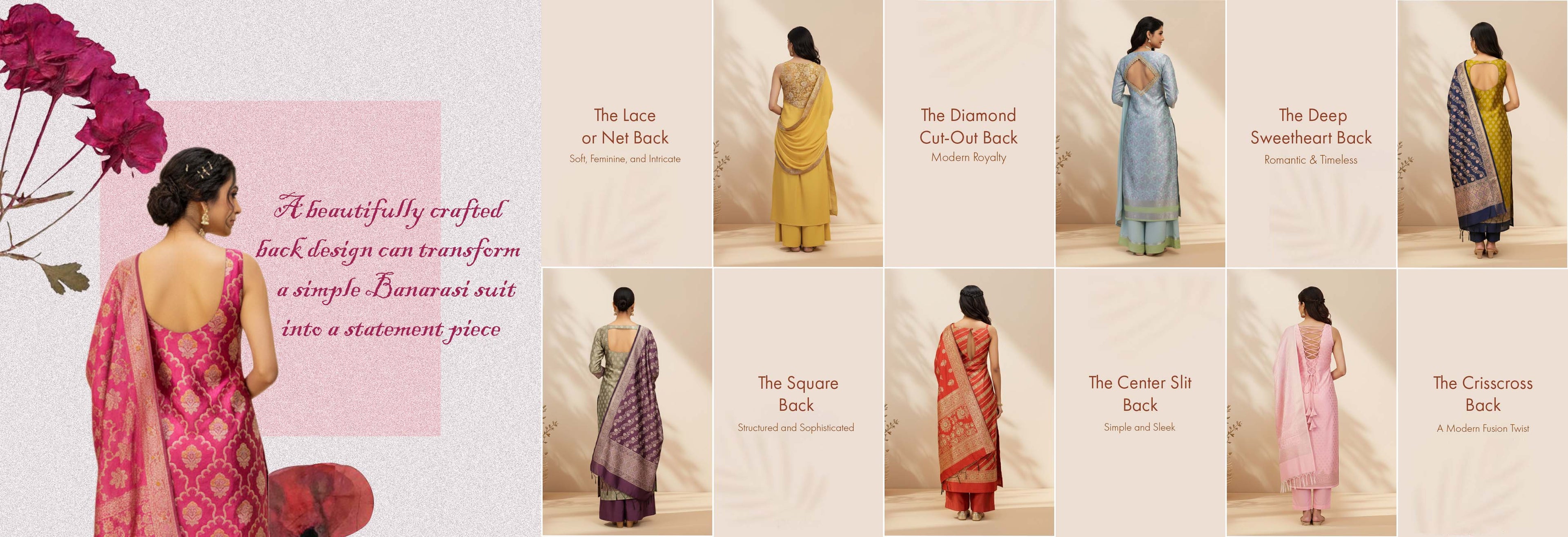 There’s something effortlessly regal about a Banarasi suit the way its silk glistens, the zari threads dance in gold, and the craftsmanship tells stories of Banaras itself. But when it comes to design, most of us focus on the neckline or sleeves and forget one important detail the back.