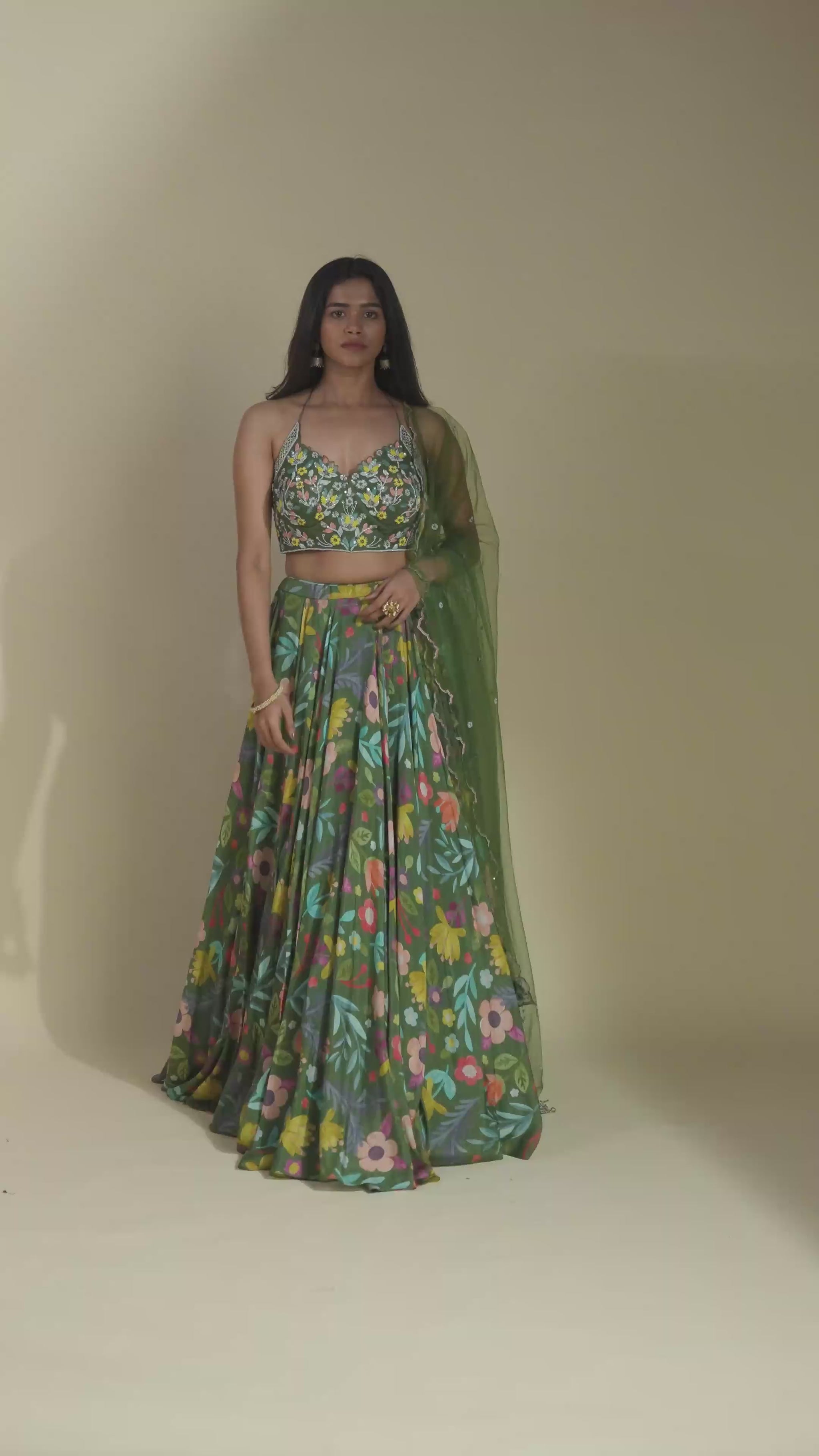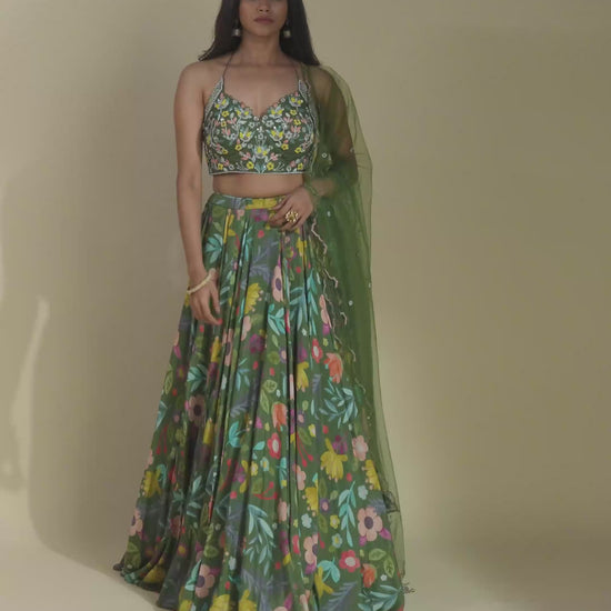 The stunning amber green hue sets a unique and eye-catching tone, while the digitally printed patterns on the lehenga skirt create a captivating visual story. Designed for movement and grace, the skirt features a built-in can-can to ensure a magnificent flare, making every twirl a moment to remember.