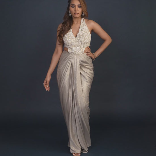 Let the unique waist cut-out and sophisticated shimmer be the focal point. Pair this grey gown with minimalistic silver or white gold jewelry, perhaps with delicate crystal accents, to complement its radiant finish. A sleek, high ponytail or sophisticated, loose waves would enhance the modern aesthetic. Opt for comfortable yet stylish high heels and a chic metallic clutch to complete your dazzling ensemble. This gown is an ideal choice for cocktail parties, club nights, sangeet functions, or any evening event where you wish to combine daring style with refined glamour.