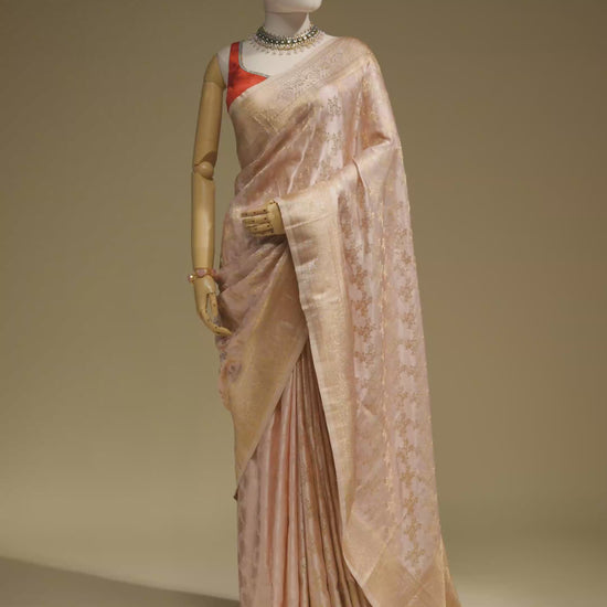 Step into unparalleled grace with the Banarasi Brocade Saree In Modal Satin With Blush Pink Hue. Order now and embrace your elegantly sophisticated style.