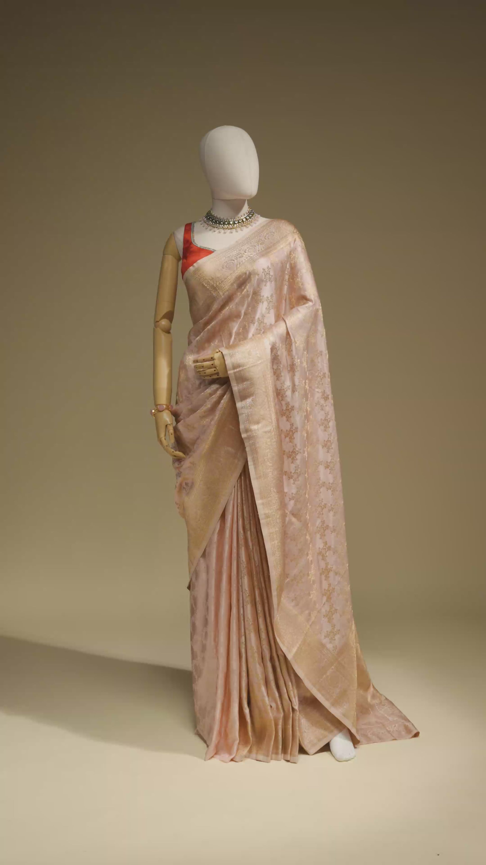 Dry Clean Only to preserve the delicate Banarasi brocade work, the luxurious Modal Satin fabric, and the beautiful blush pink color of the ensemble.
