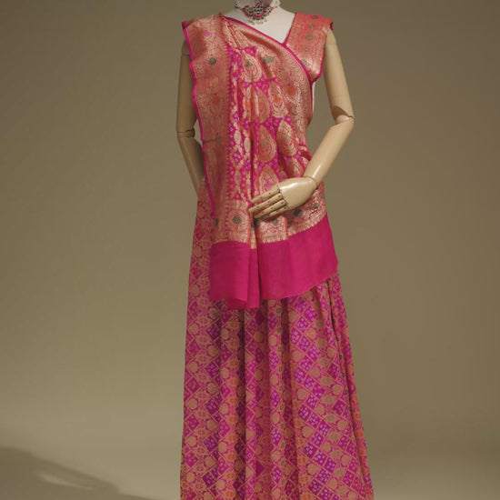 Step into unparalleled elegance with the Bandhani Saree In Rani Pink With Tilfi Gyasar Work. Order now and embrace your resplendent style.