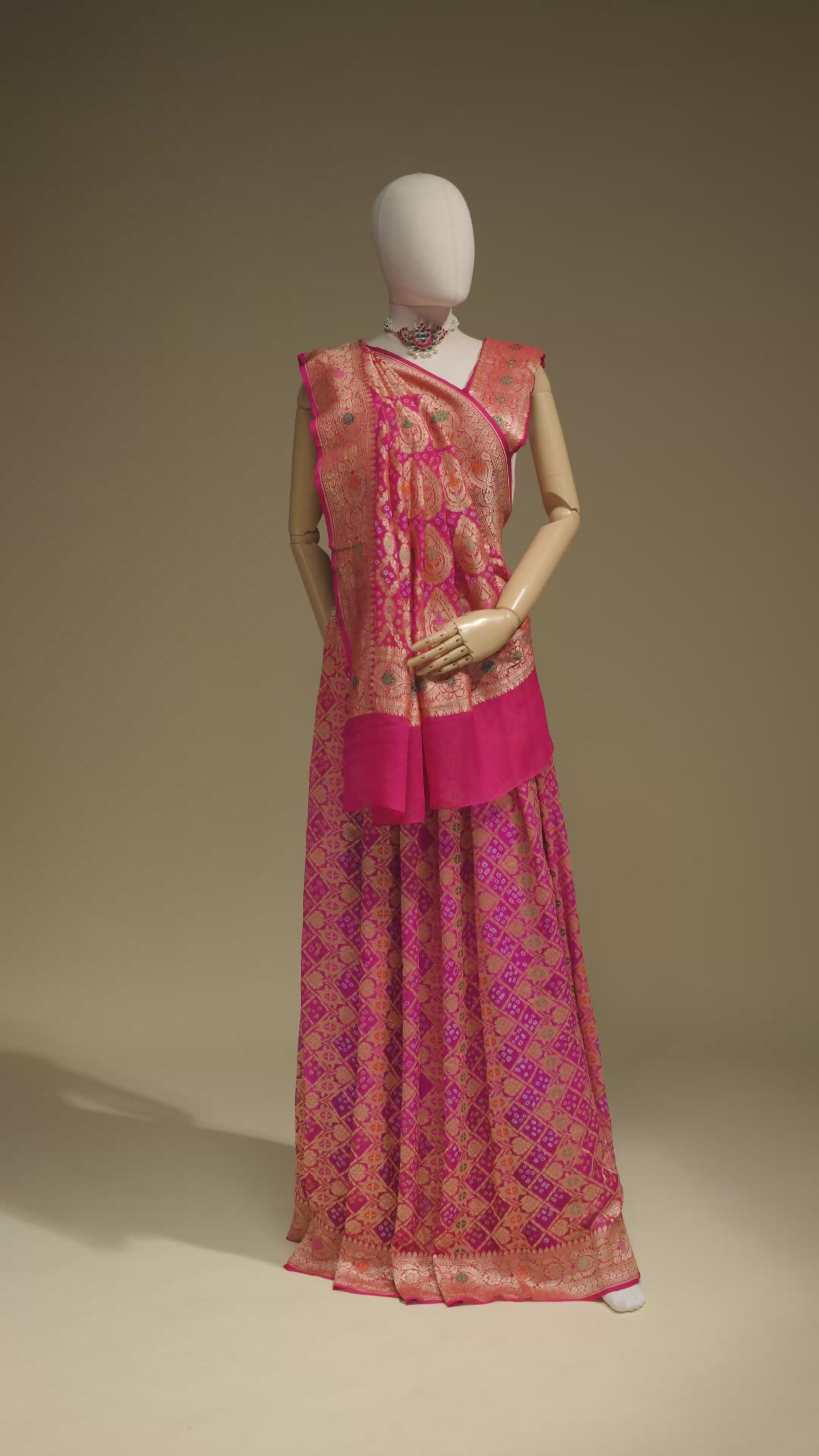 Dry Clean Only to preserve the delicate Bandhani ties, the intricate Tilfi Gyasar work, and the vibrant rani pink color of the ensemble.