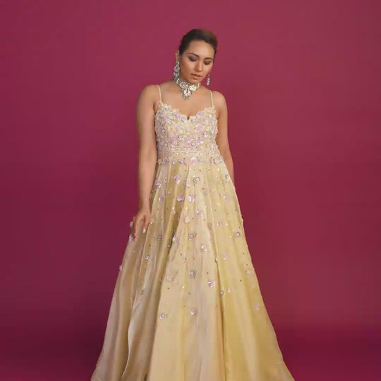 Step into a whimsical garden of elegance with the Belle Pastel Yellow With Embroidered Flowers Gown, a charming and radiant choice for any enchanting event in Mumbai's vibrant social calendar of 2025. This exquisite gown, in a delightful pastel yellow hue, exudes a joyful and sophisticated aura, reminiscent of sun-kissed blossoms. It is beautifully adorned with intricate embroidered flowers, meticulously crafted to create a delicate and artistic tapestry across the fabric, bringing a touch of nature's beauty to your ensemble.