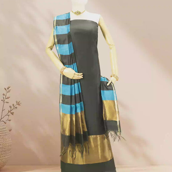 Black & Blue Silk Kurta Set With Antique Gold Embroidery, Dupatta & Pants