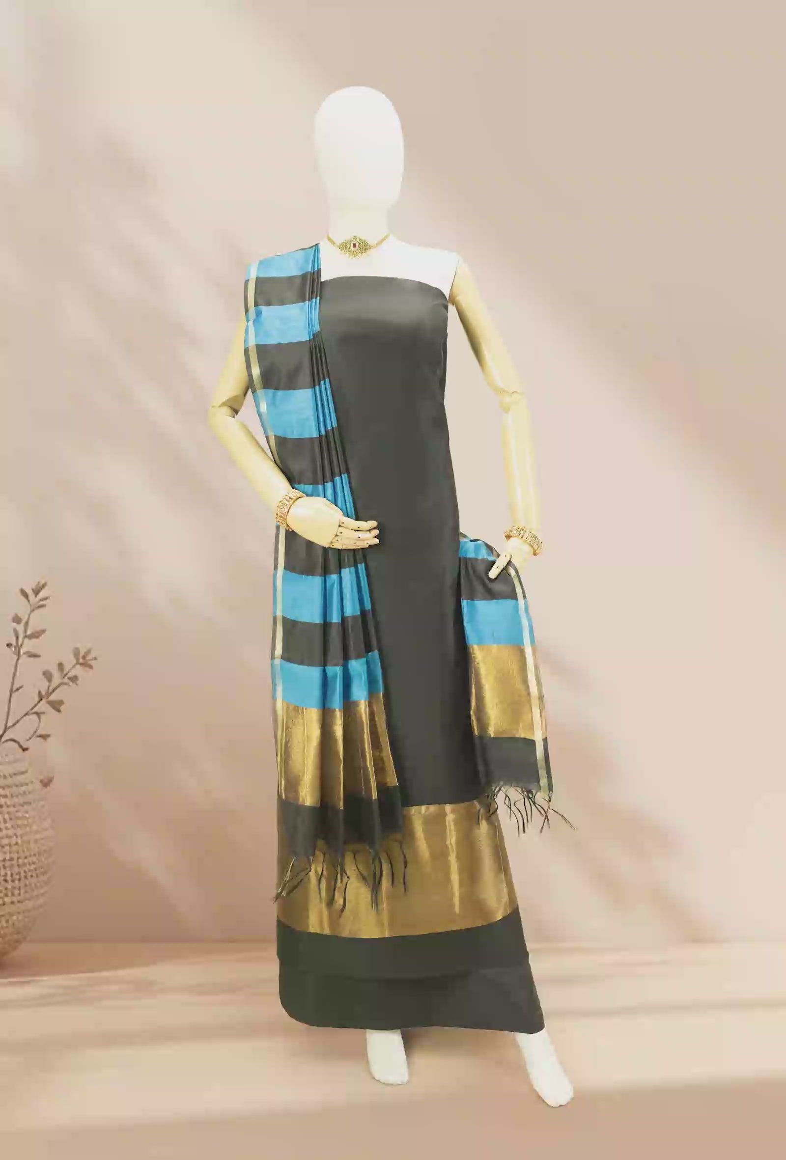 Experience the perfect blend of elegance and boldness with this black and blue silk kurta set, enriched with intricate antique gold embroidery. Made from premium silk fabric, the kurta features regal blue tones contrasted by timeless black, accented beautifully with detailed goldwork embroidery that enhances its festive appeal. The matching silk dupatta and tailored pants complete the ensemble, making it ideal for weddings, festive celebrations, and formal occasions.