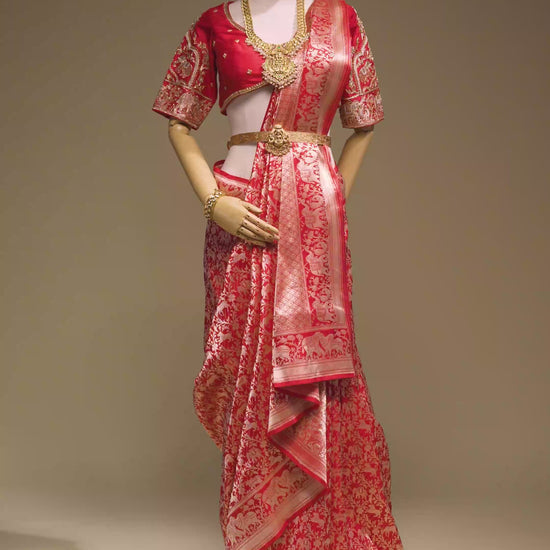 The Crimson Red Shikargah Mashru Silk Saree With Unstitched Blouse, a magnificent and artistic creation that redefines opulent elegance and traditional storytelling. This exquisite saree, in a deep and captivating crimson red hue, exudes an aura of profound sophistication and unique allure. Crafted from luxurious Pure Mashru Silk, known for its unique blend of silk and cotton that offers both lustrous sheen and comfortable drape, it features intricate Shikargah weaving. This rare and elaborate technique depicts scenes of wildlife, hunters, and natural landscapes, meticulously woven into the fabric, creating a rich visual narrative and an unparalleled layer of traditional artistry. This makes it a truly exceptional piece, perfect for making a grand and memorable entrance. This ensemble comes complete with an unstitched blouse piece, allowing for personalized tailoring to achieve a perfect fit and style.