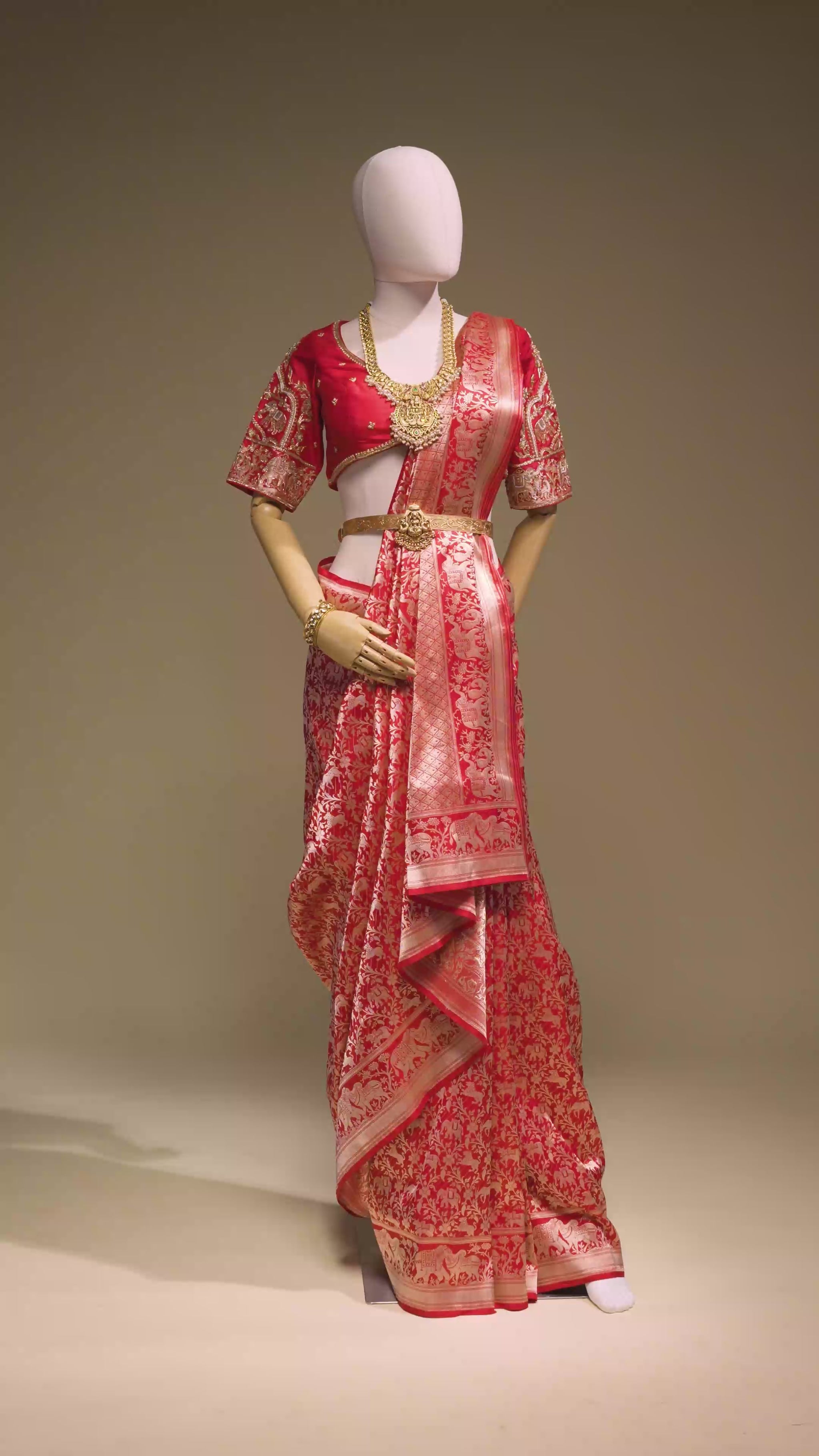 Dry Clean Only to preserve the delicate Shikargah weaving, the luxurious Mashru silk fabric, and the rich crimson red color of the ensemble.