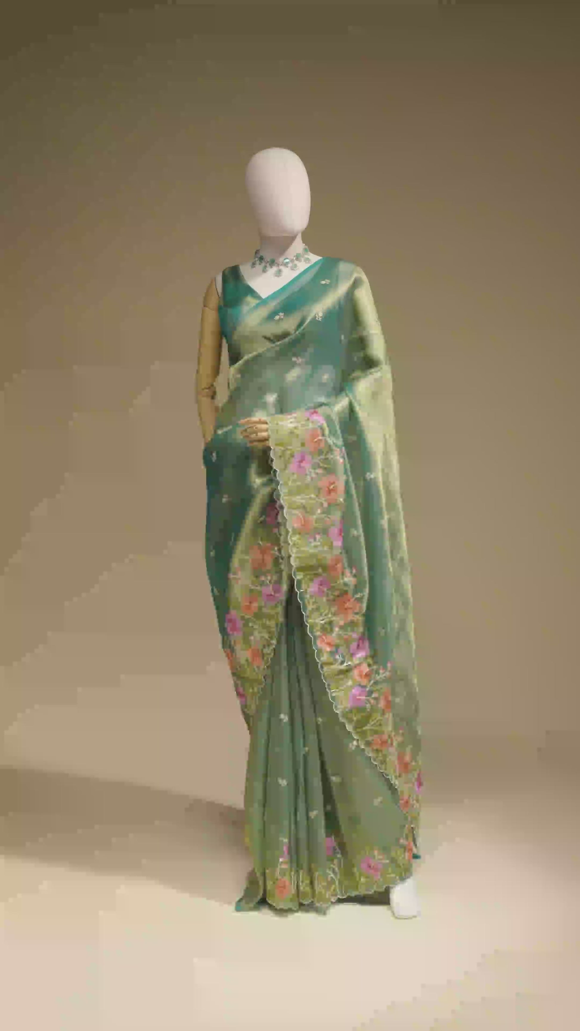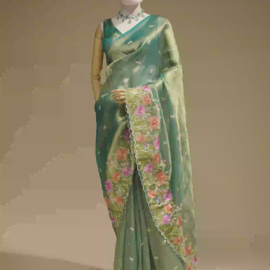 Presenting our exquisite Teal Green Crushed Tissue Silk Saree – a true embodiment of sophisticated charm and contemporary allure. Crafted from luxurious crushed tissue silk, this saree boasts a unique textured finish that beautifully catches the light, creating a dynamic and captivating shimmer.