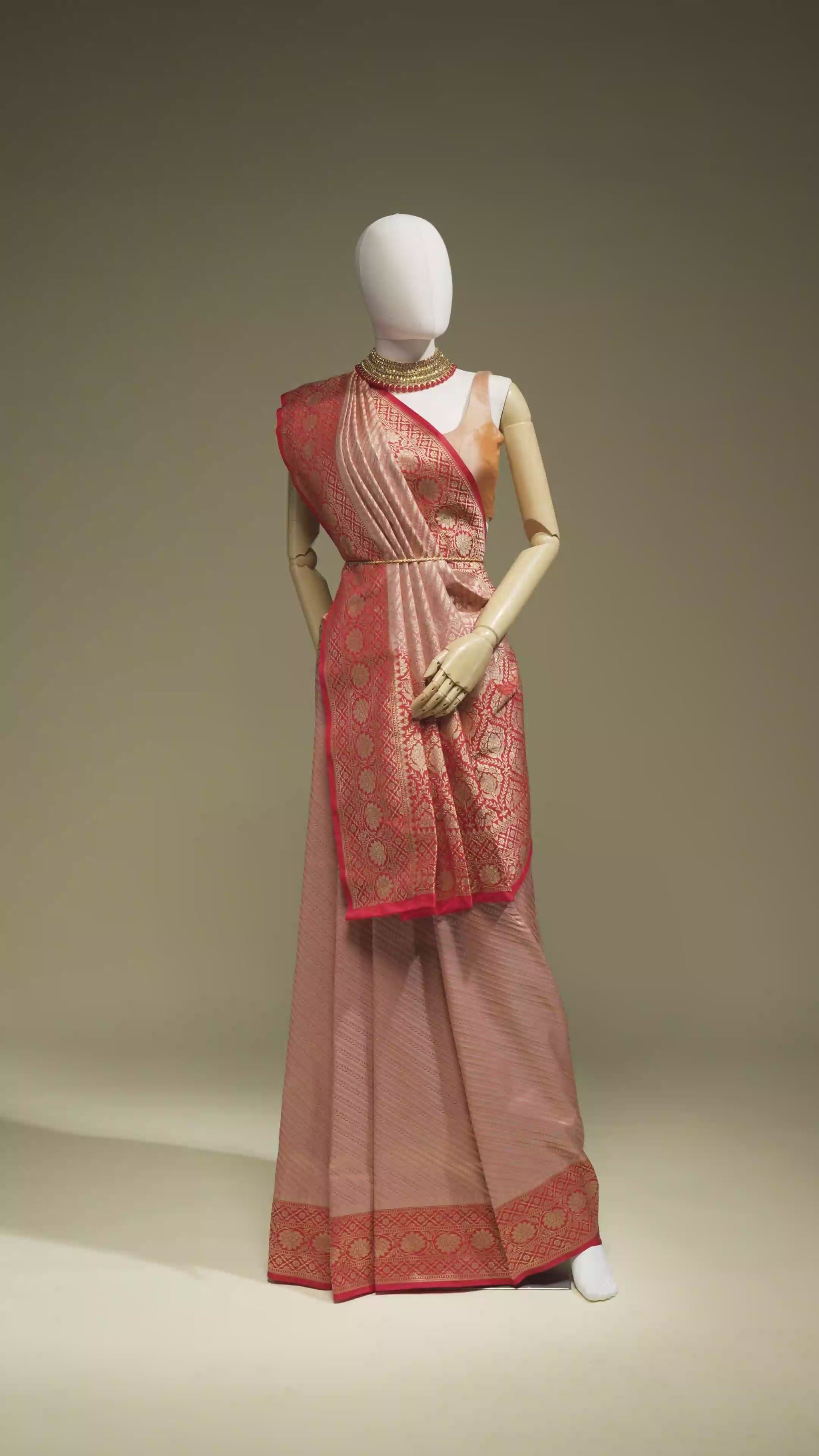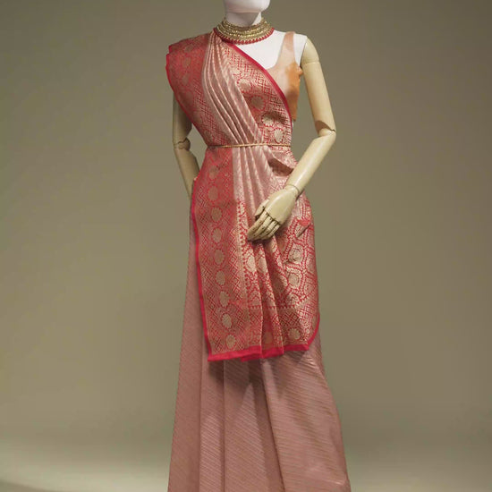 Step into unparalleled elegance with the Deep Red Light Pink Striped Silk Saree With Unstitched Blouse. Order now and embrace your uniquely stylish look.