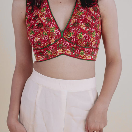 Pair this blouse with a coordinating or contrasting lehenga or saree in pastel or neutral tones to let the embroidery shine. Accessorize with subtle gold or kundan jewelry and style your hair in loose waves or a sleek ponytail. Complete your look with nude or gold-toned heels and a matching clutch for a fresh, graceful ethnic ensemble.