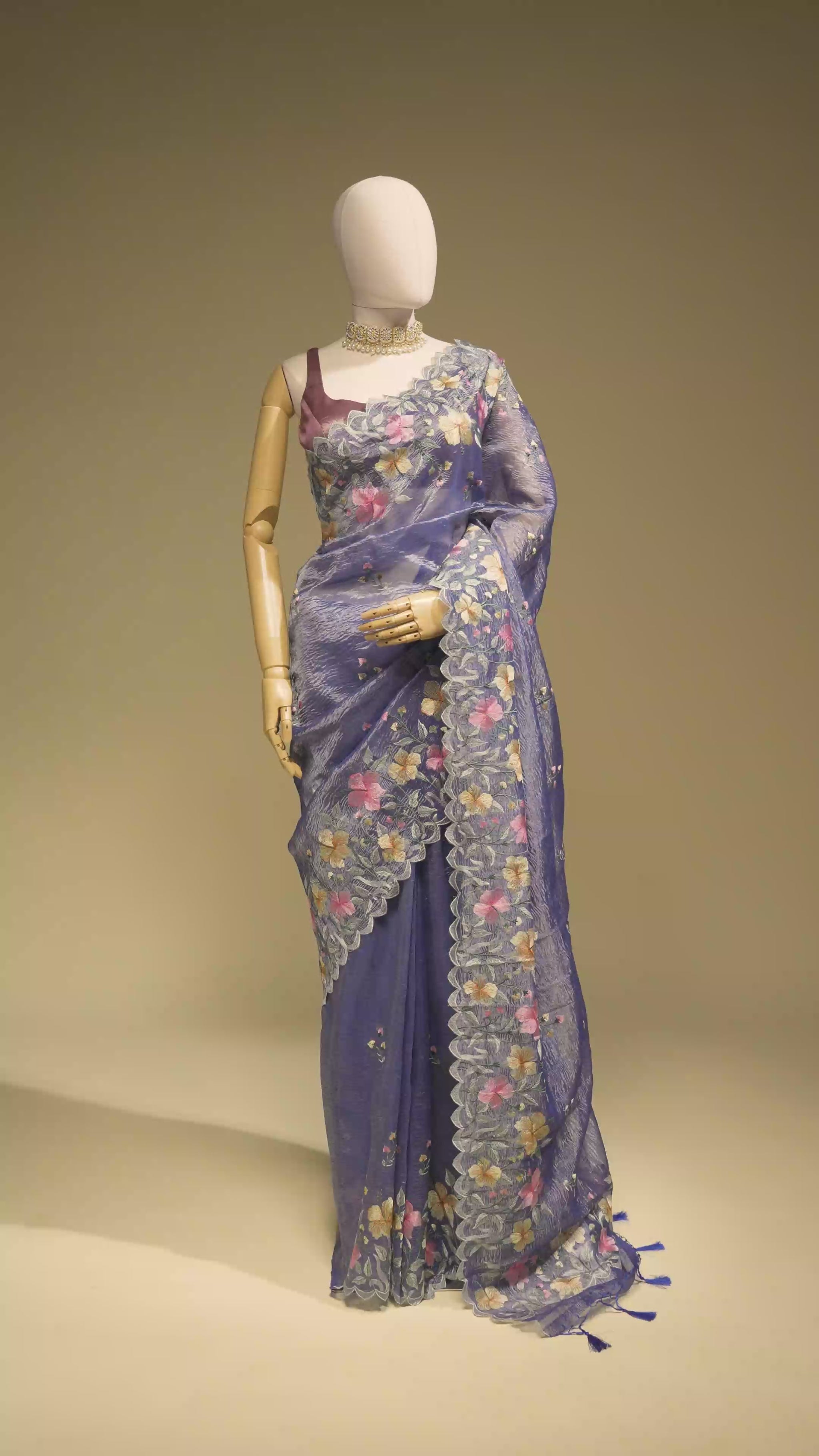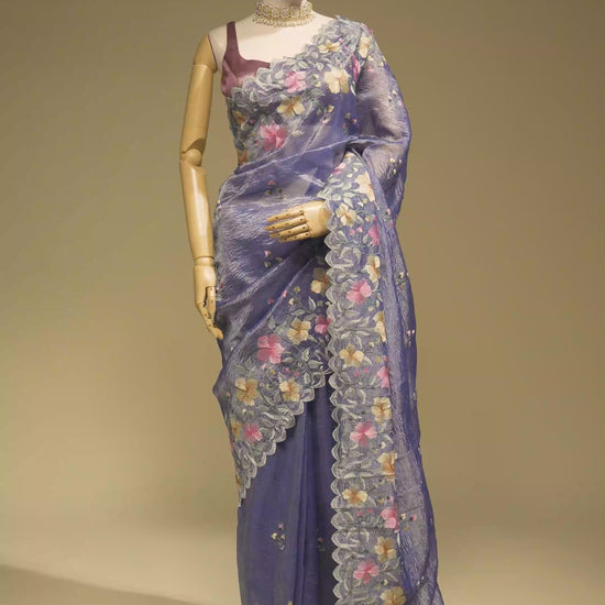 Emphasize the unique crushed texture and the serene dusty blue shade of this saree by pairing it with minimalist silver, platinum, or delicate pearl jewelry. Sleek, contemporary earrings or a delicate layered necklace would beautifully complement the saree's modern aesthetic. Opt for comfortable block heels or elegant flats in a complementary or contrasting tone and a chic, understated clutch to complete your graceful and modern look. This crushed tissue silk saree is an impeccable choice for daytime events, elegant brunches, cocktail parties, or any occasion where you wish to combine traditional material with a cutting-edge, refined appeal.