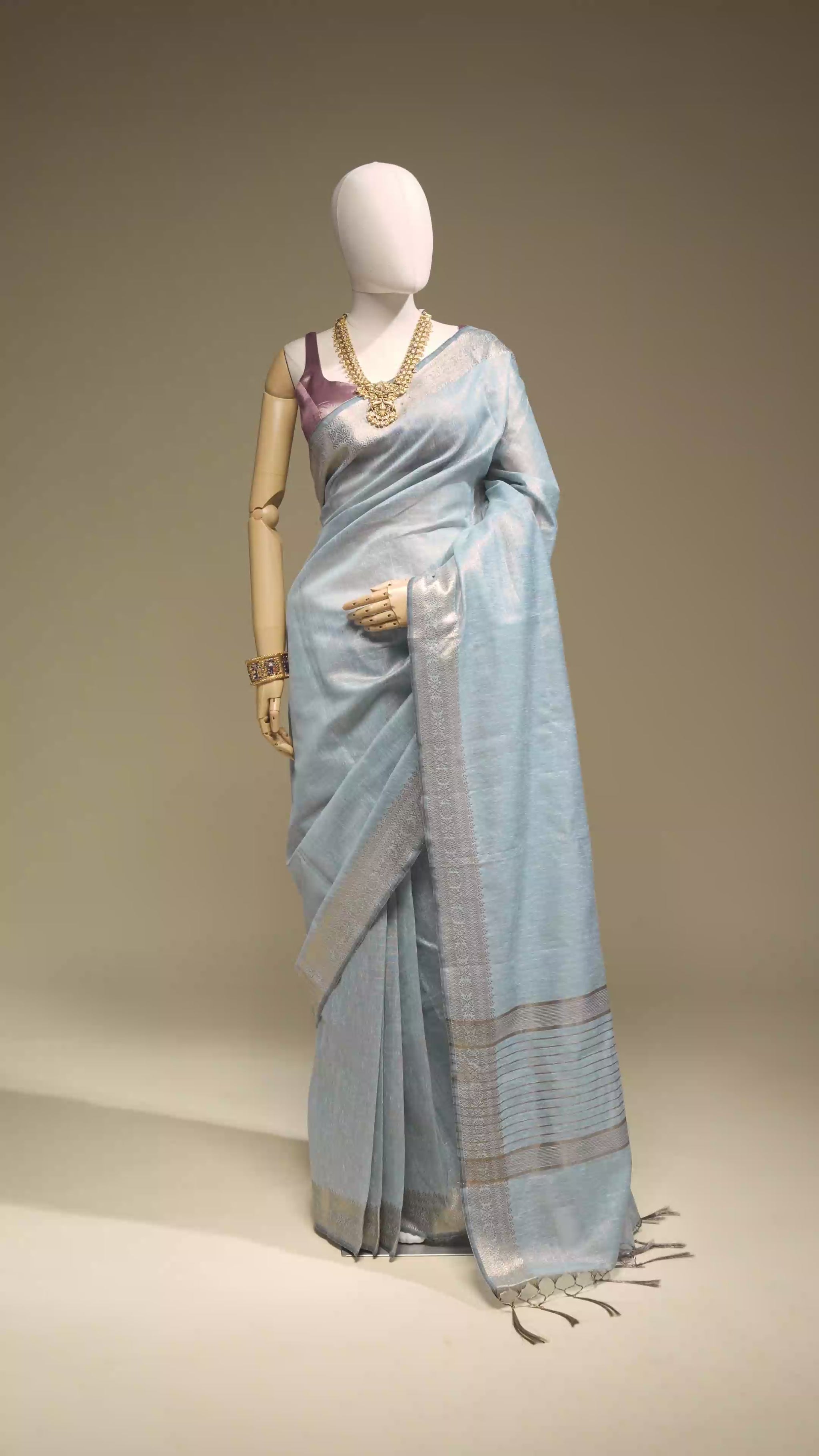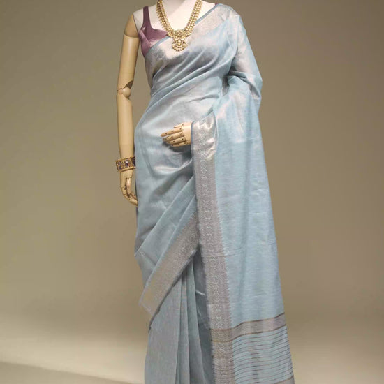 Dusty Blue Khadi Tissue Saree With Unstitched Blouse