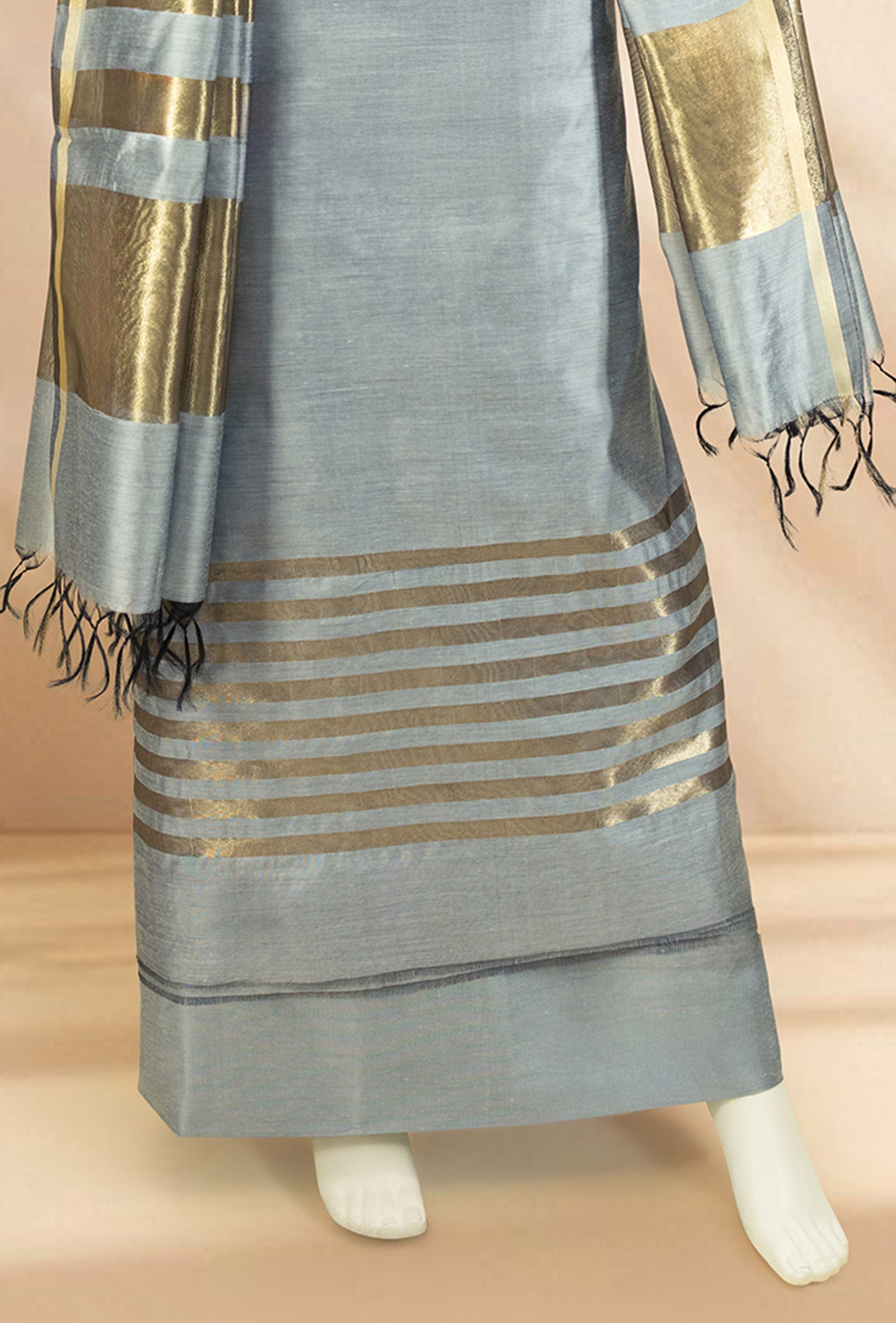 Crafted from premium silk, The beautiful and timeless kurta offers a refined texture and subtle sheen, complementing every special occasion. The ensemble is lightweight and comfortable, ensuring both style and ease of movement. Perfect for festive gatherings, traditional ceremonies, or events, this set blends classic artistry and design. Wear this grey silk suit set to create a polished and graceful look that stands out with understated charm.