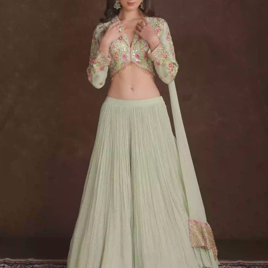 Crafted with refined detailing, this ensemble offers a structured yet fluid silhouette that’s perfect for festive gatherings, engagement ceremonies, or modern-day wedding functions. The jacket-style blouse adds a contemporary twist, making this set an ideal choice for those who love fusion fashion with a regal flair.