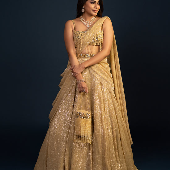 Eskimo Golden Glam Stone Work Lehenga with Sequined Attached Dupatta