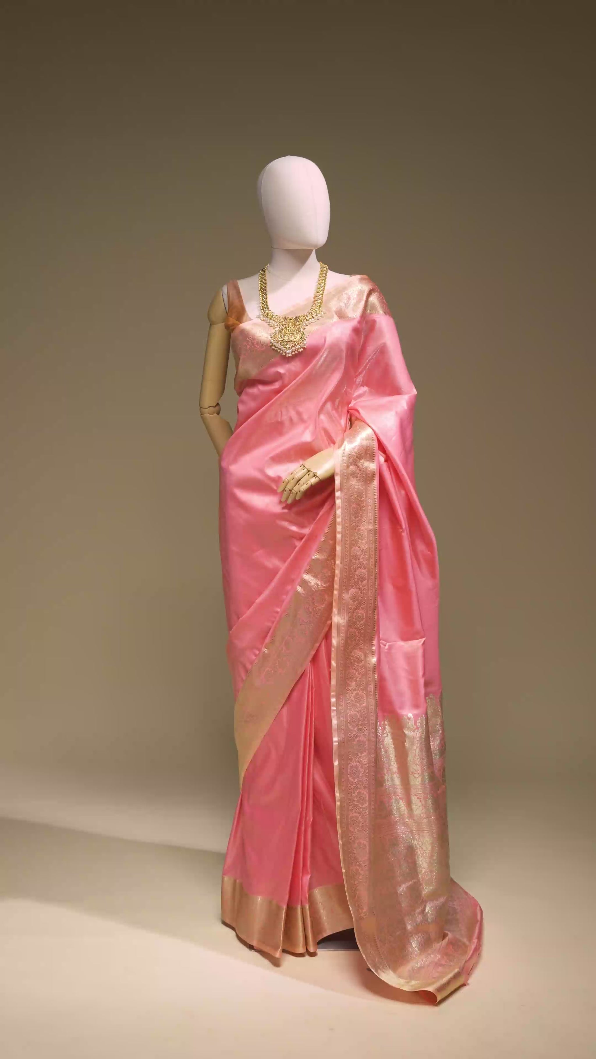 Emphasize the vibrant flamingo pink color and intricate traditional weave of this saree by pairing it with antique gold, Kundan, or delicate diamond jewelry. A statement necklace or elaborate jhumkas would beautifully complement the saree's detailing. Opt for classic gold heels and a richly embroidered potli bag to complete your majestic look. This Katan silk saree is an impeccable choice for wedding ceremonies, festive celebrations, grand receptions, or any formal event where you wish to combine traditional richness with a charming and unique flair.