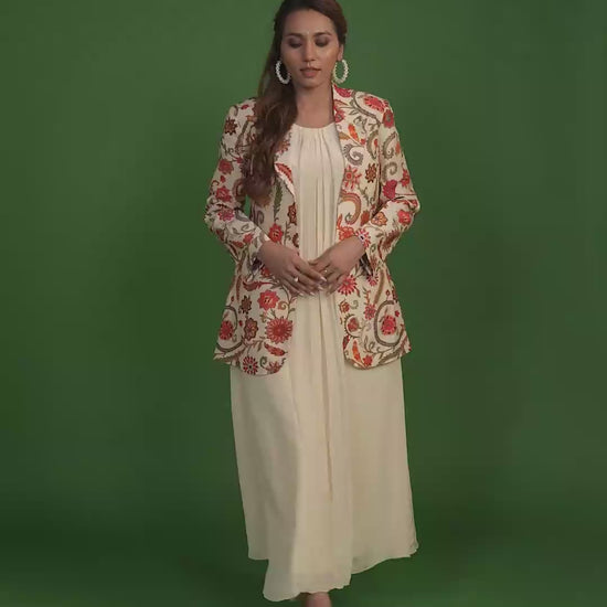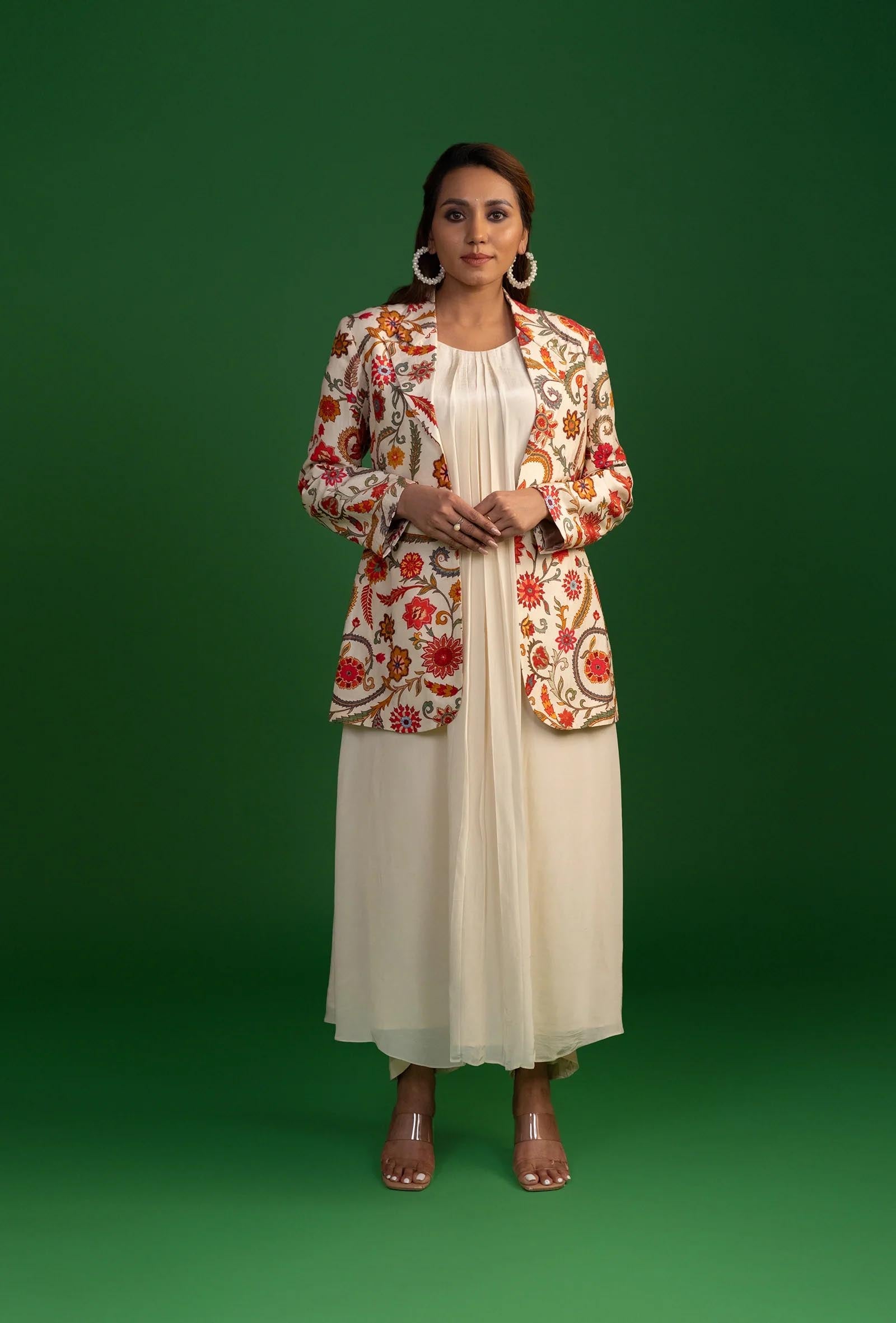 Order now and elevate your wardrobe with the contemporary grace of the Floral Blazer Jacket White Kurta Set.