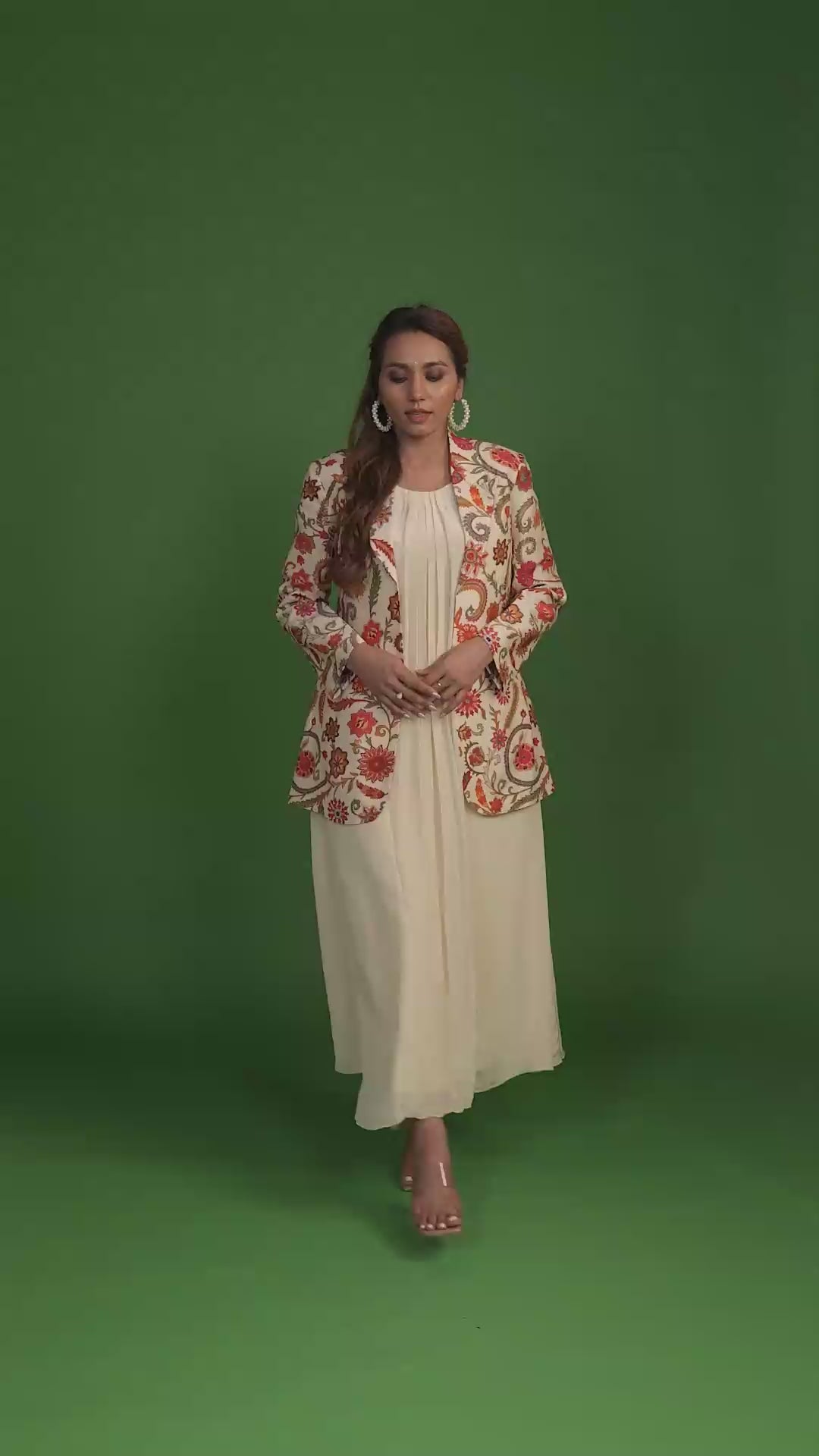 The foundation of this set is a pristine white kurta, designed for clean lines and comfortable wear. Layered over it is a chic floral blazer jacket, which serves as the highlight of the outfit. The delicate and vibrant floral print on the blazer adds a touch of natural beauty and contemporary flair, beautifully contrasting with the serene white of the kurta. The set is completed with coordinating bottoms, ensuring a polished and cohesive look.