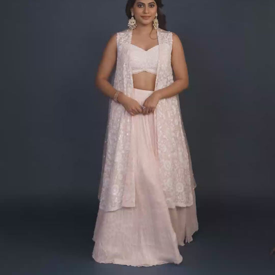 Feel absolutely radiant in our Glacier Peach Three-Piece Embroidered Lehenga Set! This dreamy outfit, in a soft pink (like a perfect peach blush), blends luxurious Georgette and Net fabrics for a beautiful, light drape. It's a complete look, featuring an embroidered lehenga skirt with a built-in can-can for grand volume, a chic sleeveless blouse with a plunging sweetheart neck and padding, and an elegant embroidered jacket for added sophistication and versatility.