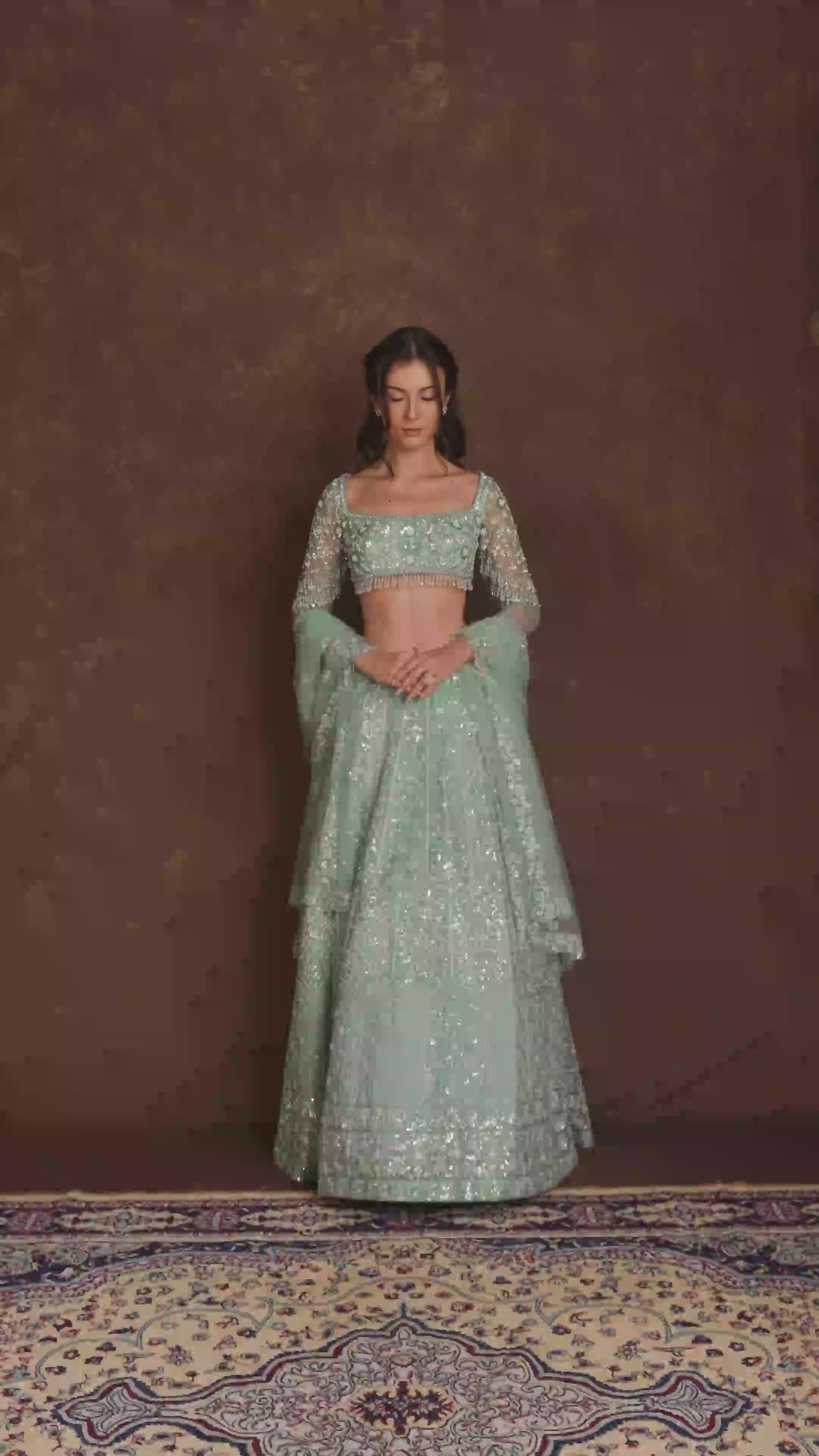 Paired with a flowing skirt in a refreshing mint blue shade, this set offers the perfect blend of subtle color and dazzling detail—ideal for cocktail parties, receptions, or festive soirées.