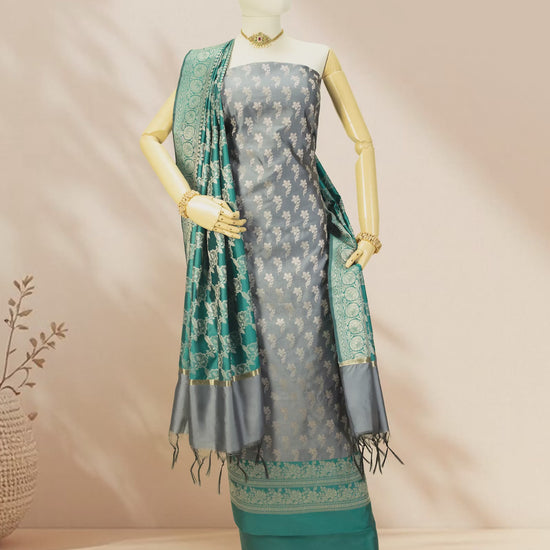 Elevate your ethnic wardrobe with this Grey & Green Banarasi Silk Suit Piece, featuring a luxurious kurta, elegant pure silk pant, and matching Banarasi dupatta. Perfect for weddings, festivals, and traditional occasions, this 3-piece suit combines comfort with grace & elegance.