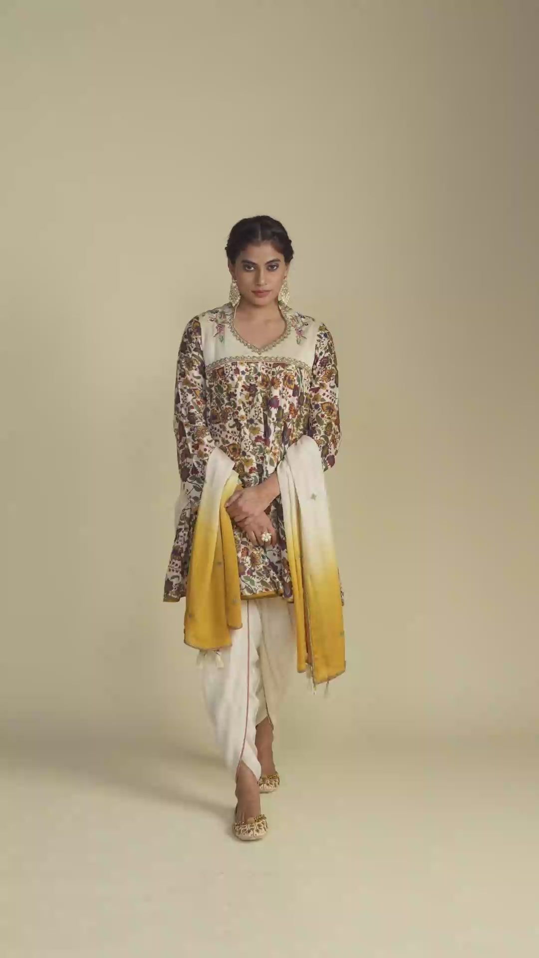 Emphasize the delicate ivory and the charming floral print by pairing this set with minimalist gold, pearl, or oxidized silver jewelry. Simple stud earrings, a delicate necklace, or a subtle bracelet would complement the print beautifully. Opt for comfortable yet stylish embellished juttis or flats, and a chic clutch or small potli bag to complete your graceful and relaxed look. This kurta dhoti set is an ideal choice for daytime events, festive brunches, casual family gatherings, or any occasion where you desire a blend of traditional charm and modern comfort.