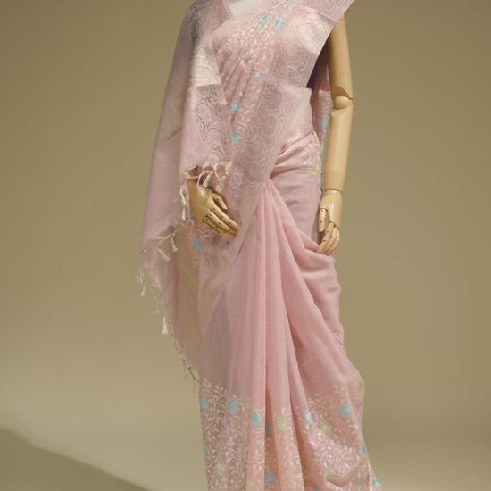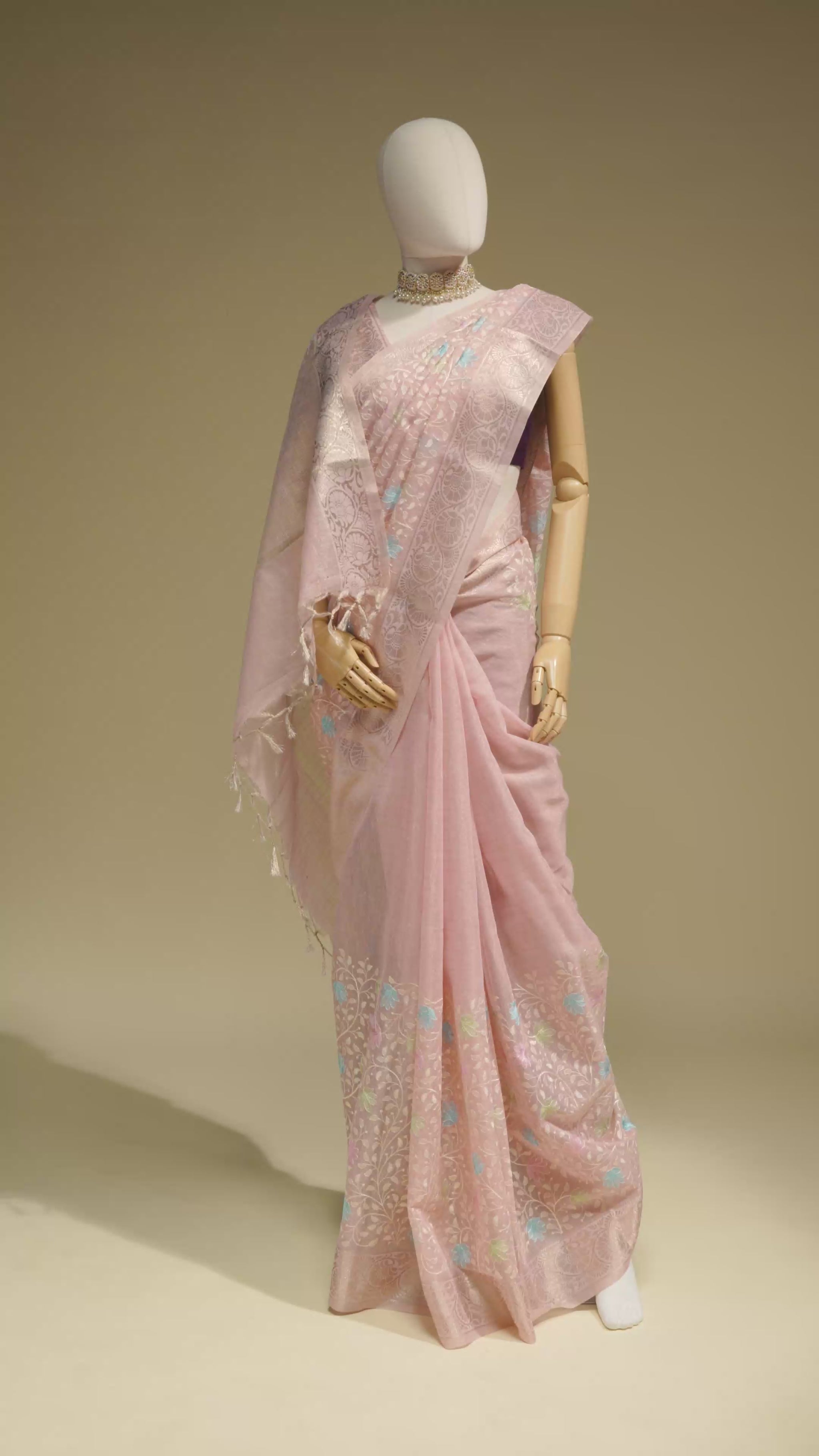 Dry Clean Only to preserve the delicate Meenakari florals, the airy Khadi Georgette fabric, and the beautiful light pink color of the saree.