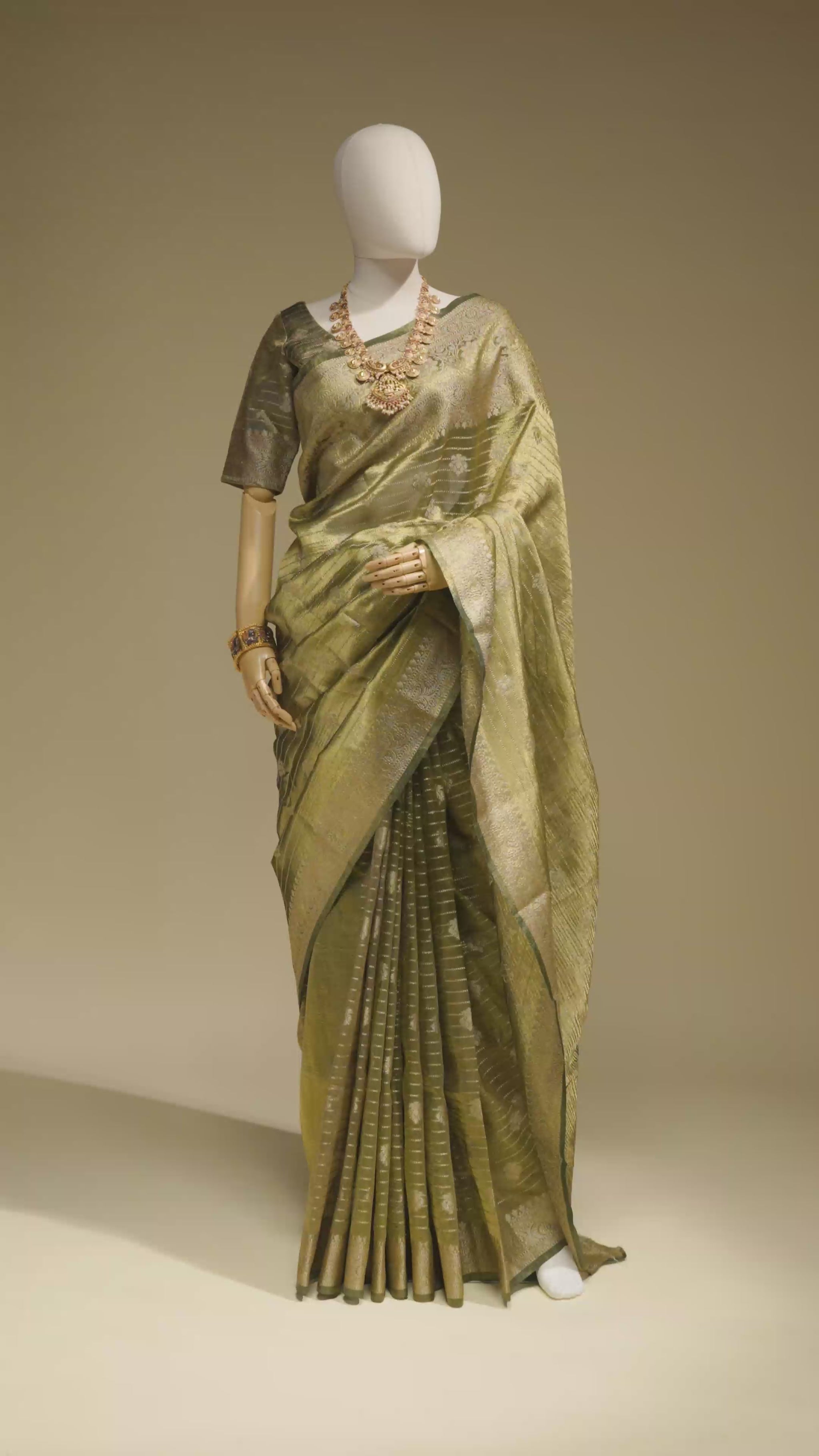 Dry Clean Only to preserve the delicate Khadi tissue fabric and the beautiful olive green color of the saree.