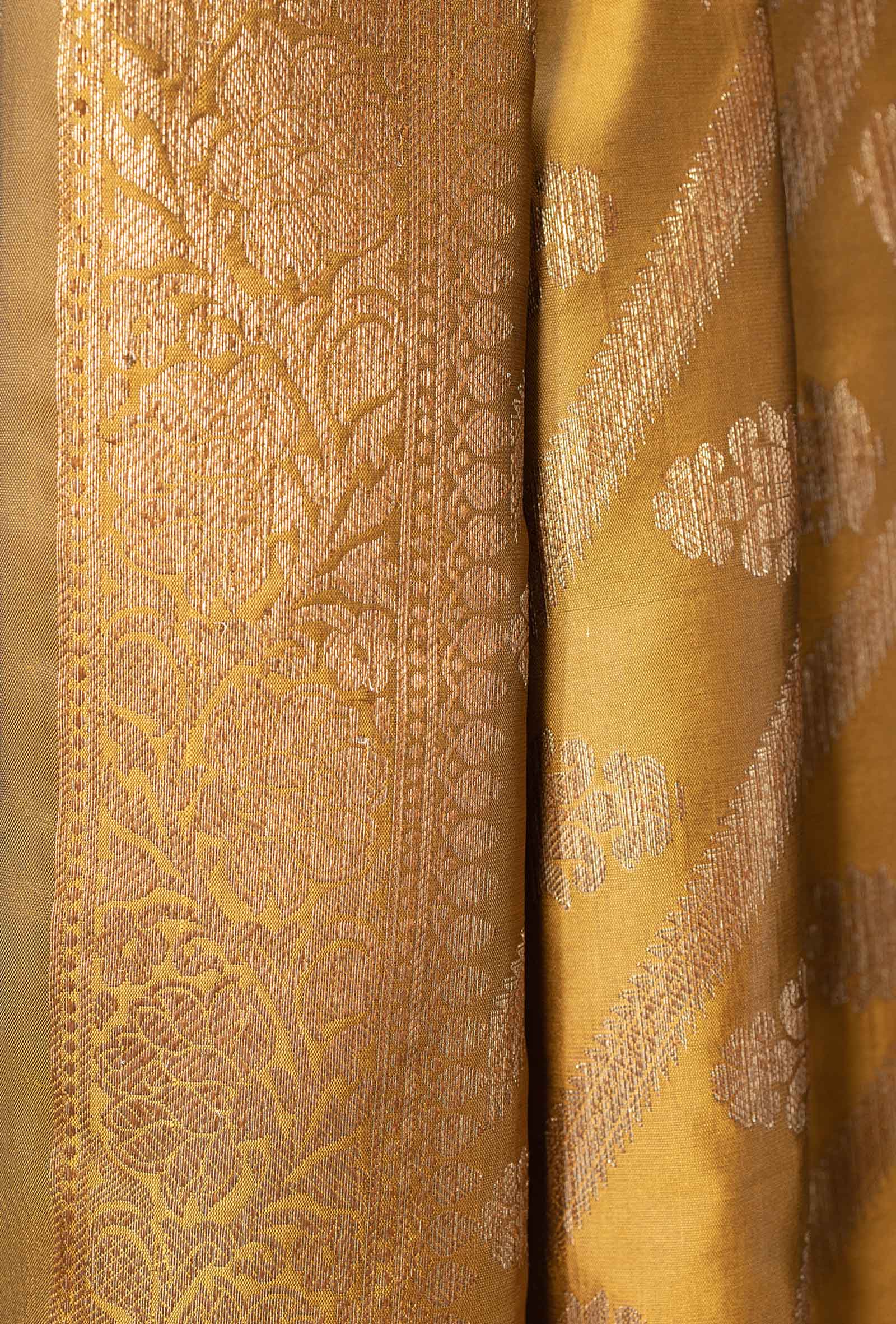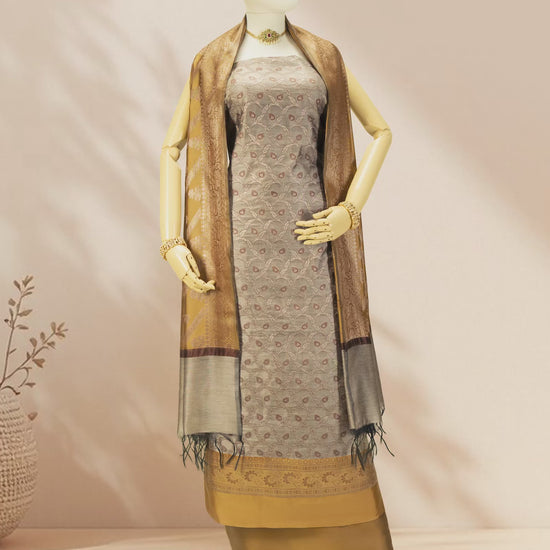 Bring warmth to your festive wardrobe with this Khaki & Mustard Banarasi Silk Suit Piece, paired with a luxurious Pure Silk Pant. The rich mustard tones blend beautifully with earthy khaki, enhanced by fine Banarasi weaving for a regal touch.