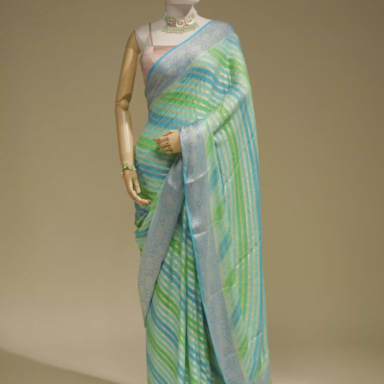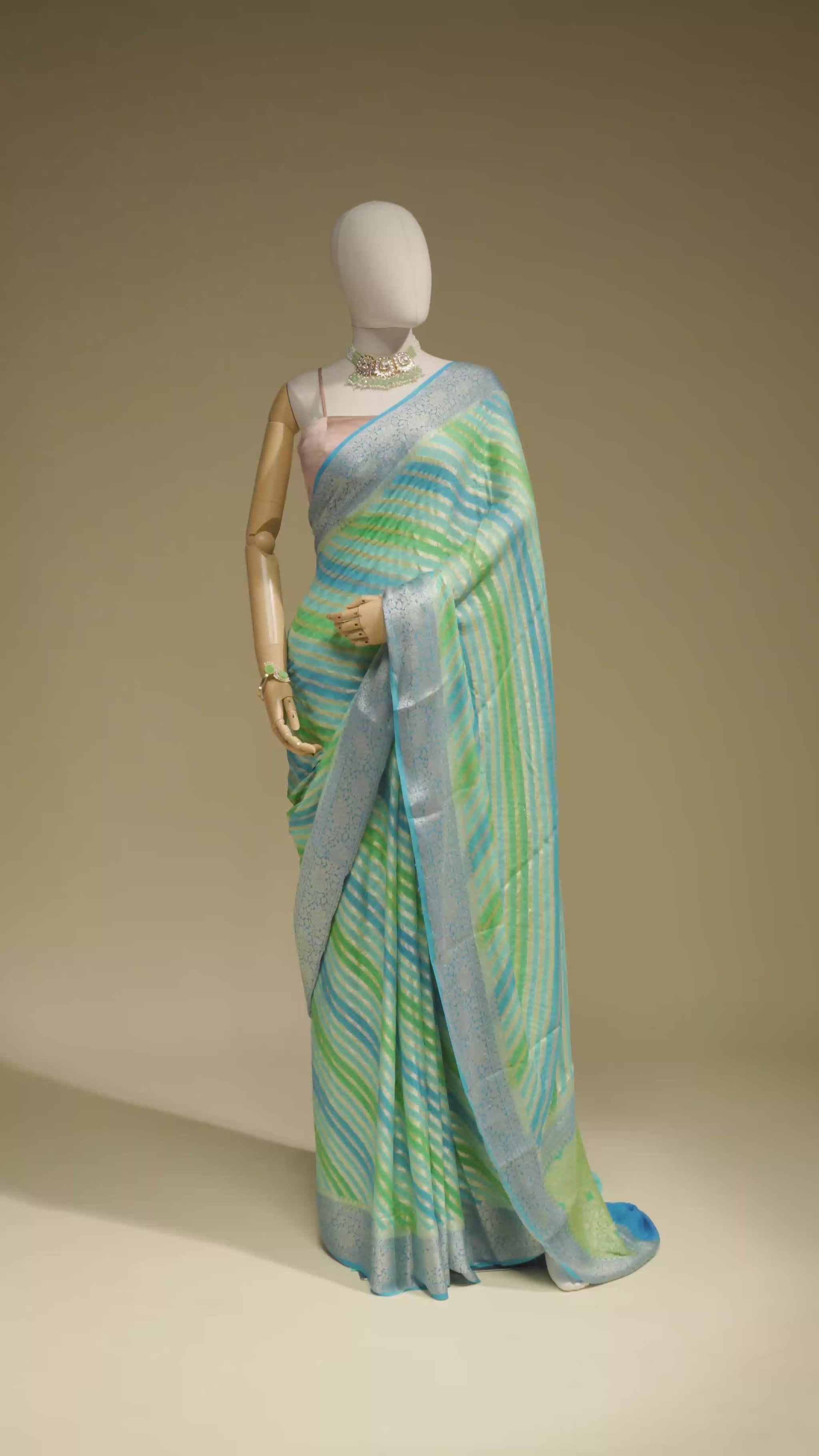 The Lehriya Georgette Saree In Blue Green With Bold Stripes, a vibrant and contemporary creation that redefines modern fluidity and dynamic style. This exquisite saree, in a captivating blend of blue and green hues, features the iconic Lehriya wave pattern, artfully rendered in bold and striking stripes. Crafted from lightweight Georgette, it offers a beautifully fluid drape and an exceptionally comfortable feel, perfect for embracing elegance with a confident stride. The vivid color combination and the impactful stripe design create a lively and fashion-forward aesthetic, ideal for making a stylish statement.