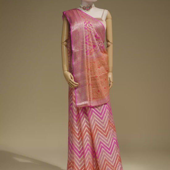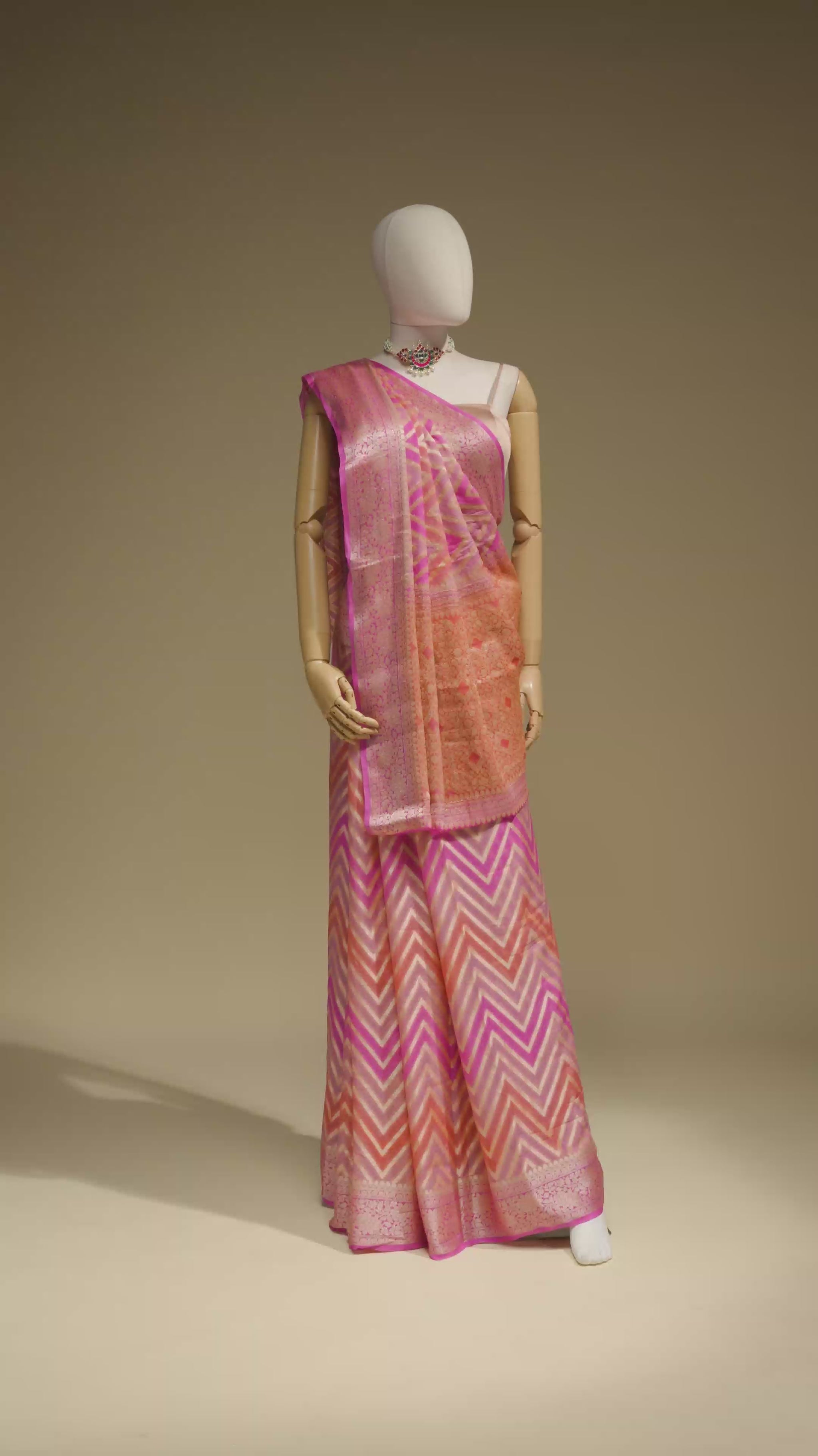 The Lehriya Rangkaat Saree In Georgette With Pink Tricolor Design, a mesmerizing and contemporary creation that redefines artistic elegance and vibrant allure. This exquisite saree, crafted from fluid Georgette, showcases the iconic Lehriya wave pattern, uniquely combined with the striking Rangkaat technique. The design features a captivating tricolor palette predominantly in pink, with two other complementary shades, creating a harmonious and dynamic visual feast. This fusion of traditional motifs with a modern color block approach offers a beautifully fluid drape and an exceptionally graceful movement, perfect for making a sophisticated and artistic statement.