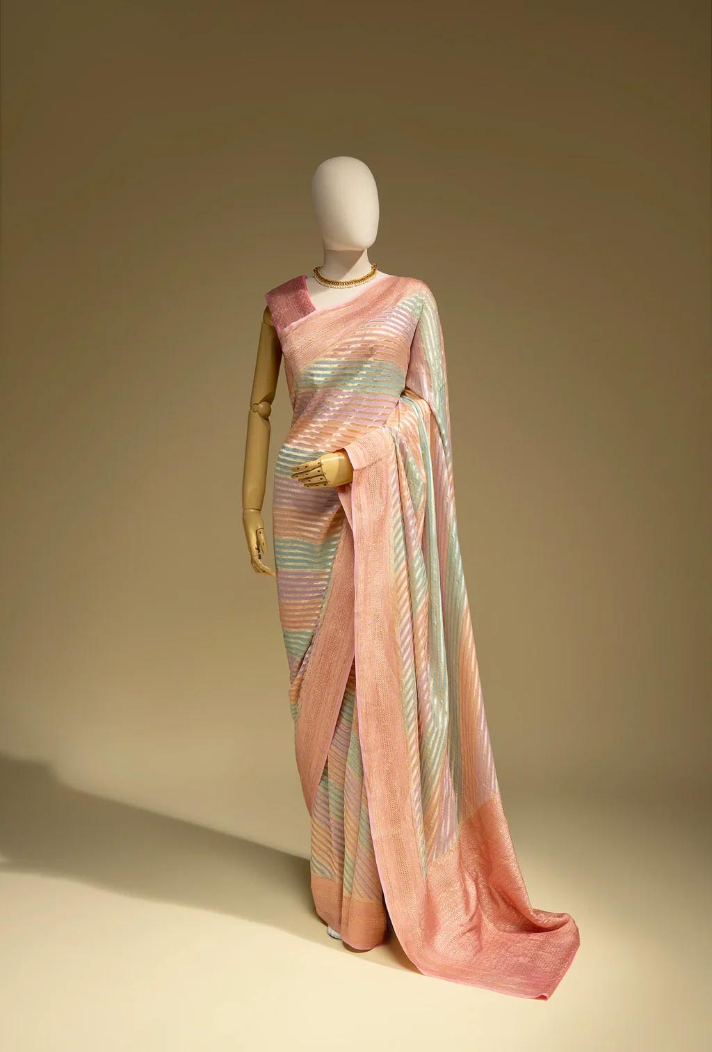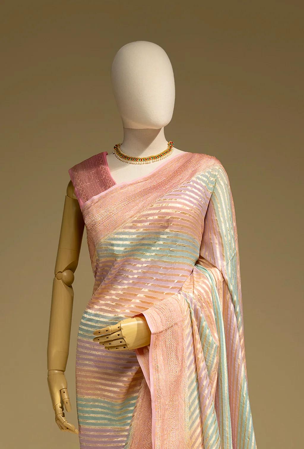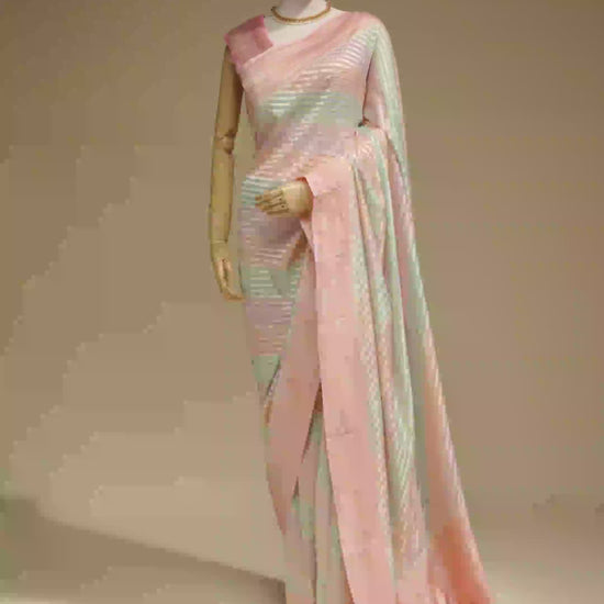 Step into unparalleled serenity with the Lehriya Saree In Khadi Chiffon In Light Pink With Pastel Stripes. Order now and embrace your gracefully light style.