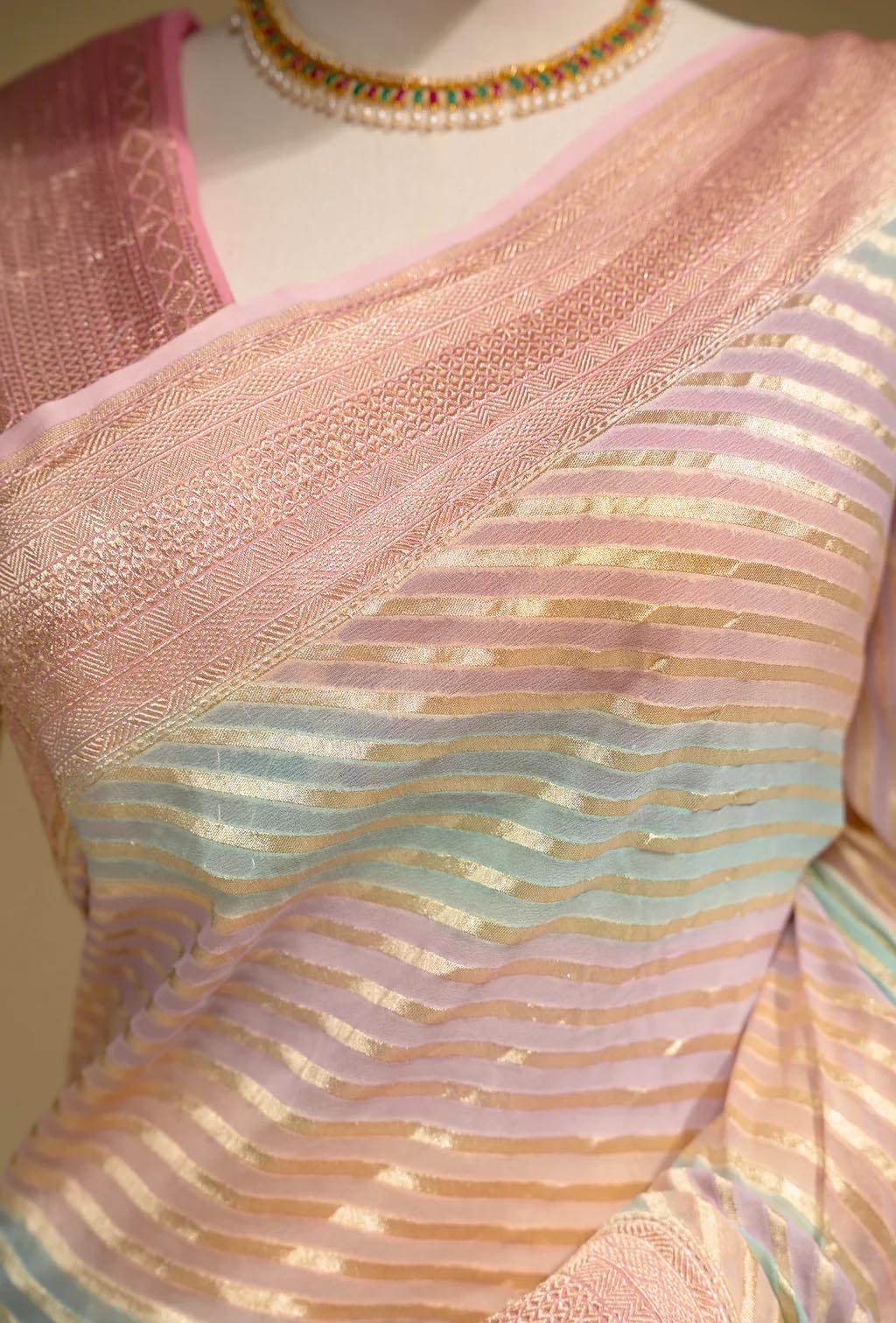 Lehriya Saree In Khadi Chiffon In Light Pink With Pastel Stripes