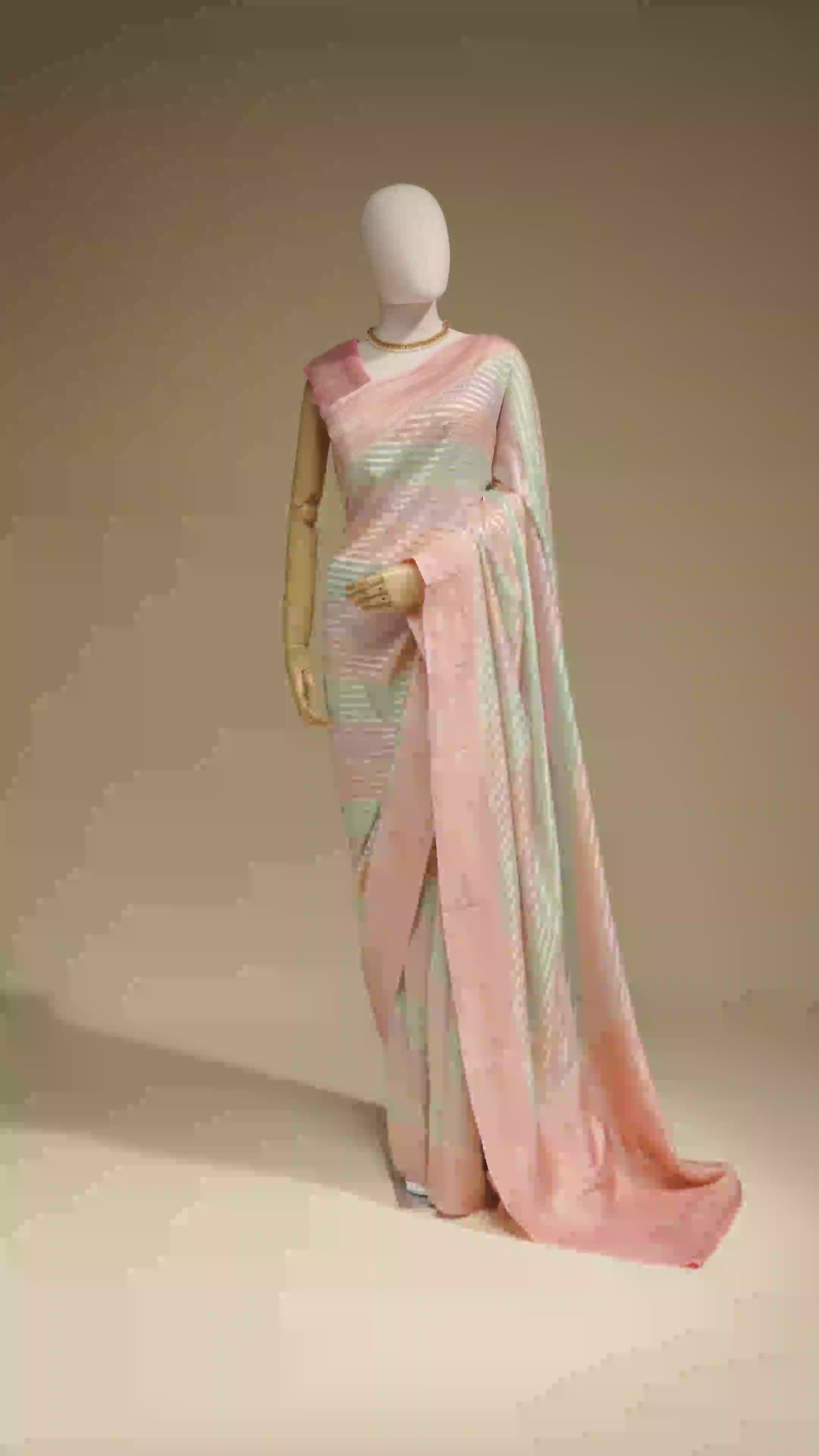 Dry Clean Only to preserve the delicate Lehriya pattern, the airy Khadi Chiffon fabric, and the gentle colors of the saree.