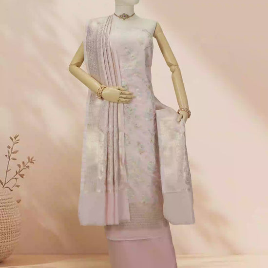 The subtle light peach kurta set is made to make you stand out with its soft Chanderi silk fabric with beautiful antique gold embroidery. Crafted from premium silk, the kurta features delicate antique gold accents that beautifully complement the soft peach base. The set includes a kurta, matching pants, and a dupatta. The fabric is light and comfortable, perfect for special occasions.