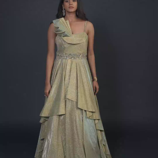 The Luna Golden Green Multilayered Stone Work Gown, a truly enchanting and magnificent creation that redefines opulent glamour and ethereal beauty. This exquisite gown, in a captivating golden green hue, emanates an aura of profound sophistication and magical allure. Designed with a multilayered silhouette, it offers a flowing and dramatic drape that commands attention with every movement. It is lavishly adorned with intricate stone work, where countless shimmering stones are meticulously hand-embellished across the fabric, creating a dazzling display of light and adding an unparalleled layer of traditional artistry and lavish visual texture. This makes it a truly exceptional piece, perfect for making a grand and unforgettable entrance at the most exclusive events.