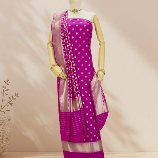 Turn heads with this Magenta Pink Banarasi Silk Suit Piece, paired with a luxurious Pure Silk Pant. The vibrant magenta enhances the rich texture of the Banarasi fabric, having charm in every detail. Perfect for festive occasions, grand celebrations, and weddings.