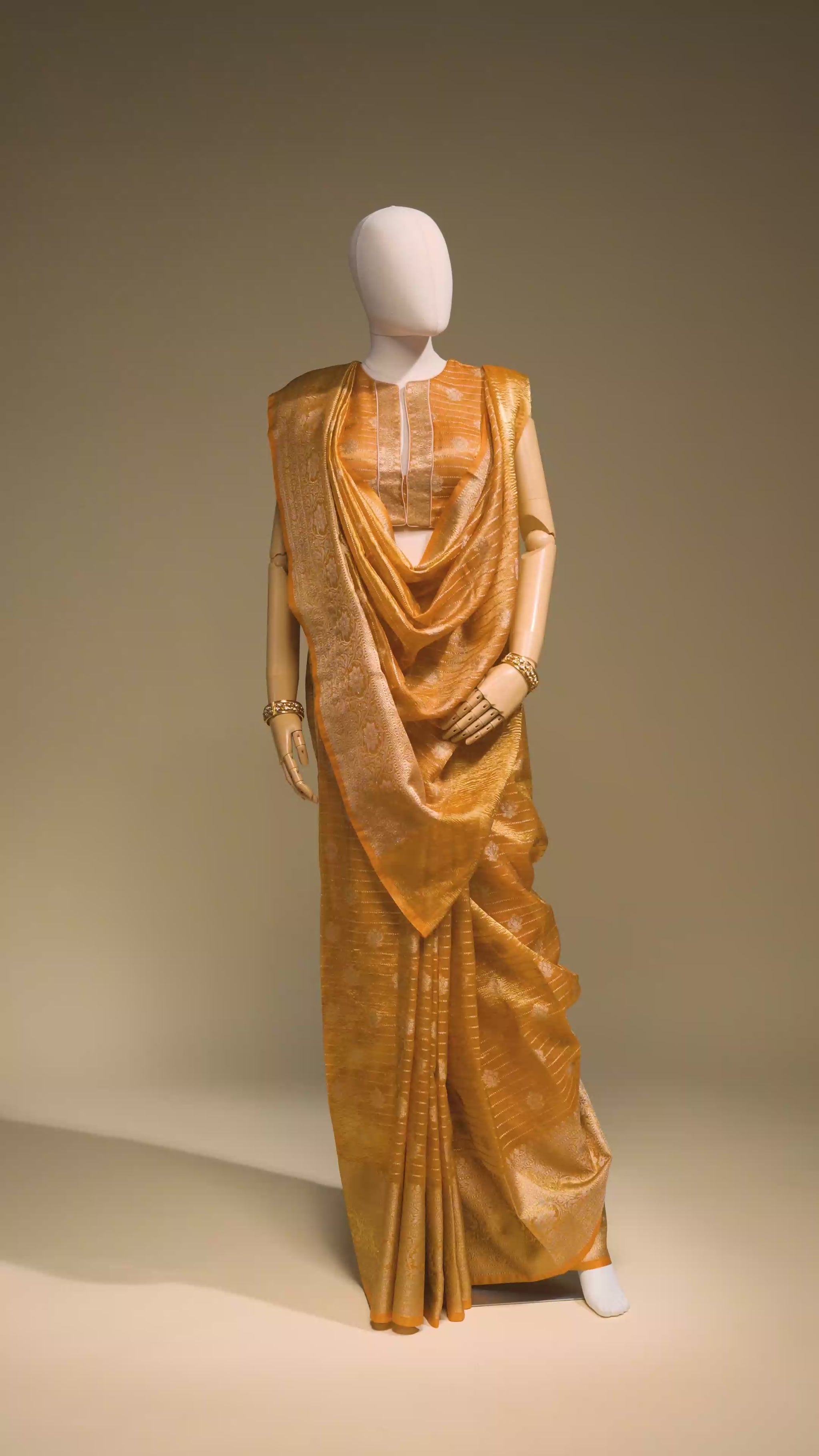 Dry Clean Only to preserve the unique crushed texture, the delicate Tissue Silk fabric, and the beautiful marigold yellow color of the saree. Handle with extreme care to maintain the integrity of the crushed effect.