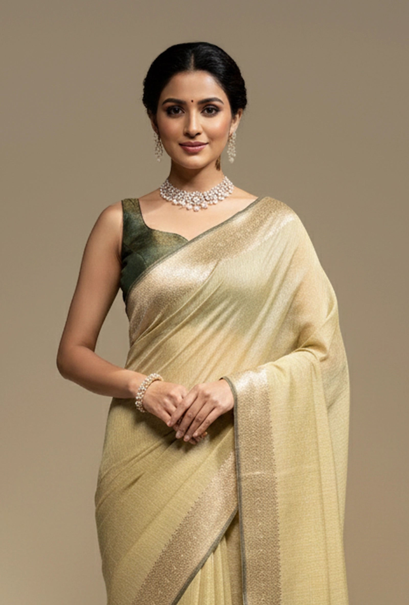 Emphasize the earthy tones and delicate texture of this saree by pairing it with minimalist gold, antique gold, or wooden jewelry. Delicate stud earrings or a slender chain would complement the saree's understated beauty beautifully. Opt for comfortable block heels or elegant flats in earthy tones and a light-toned or woven clutch to complete your refined and serene look. This Khadi tissue saree is an impeccable choice for daytime events, intimate gatherings, outdoor ceremonies, or any occasion where you wish to combine traditional craftsmanship with a modern, nature-inspired aesthetic.