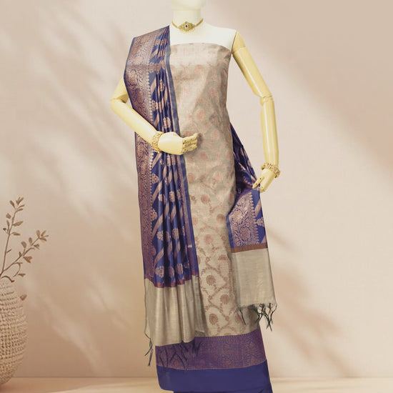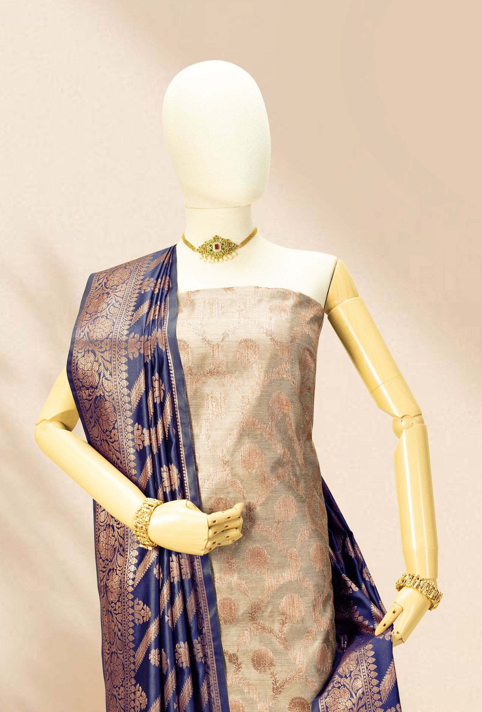 Navy Blue & Khaki Banarasi Silk Suit Set – Kurta, Pure Silk Pant & Dupatta