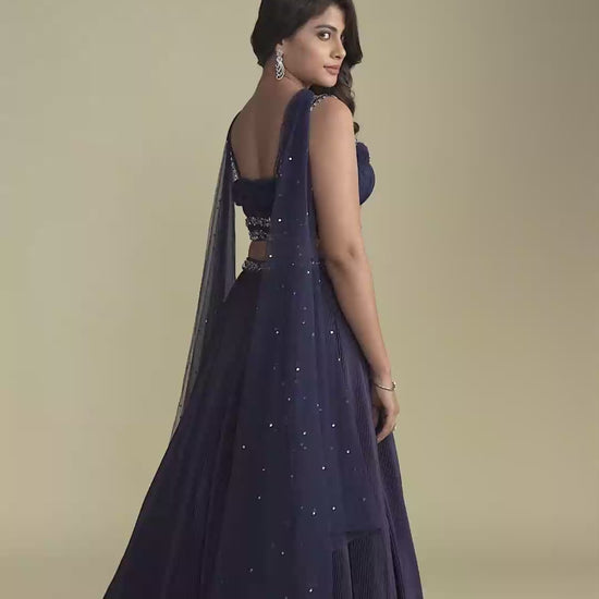 Enhance the rich navy blue and the playful ruffles of this set by pairing it with silver, diamond, or pearl jewelry. A delicate necklace or statement earrings would beautifully complement the ensemble without overwhelming its intricate details. Opt for classic black or metallic heels and a sophisticated clutch to complete your refined and elegant look. This lehenga set is an impeccable choice for evening receptions, cocktail parties, formal dinners, or any special occasion where you wish to combine traditional grace with a modern, romantic flair.