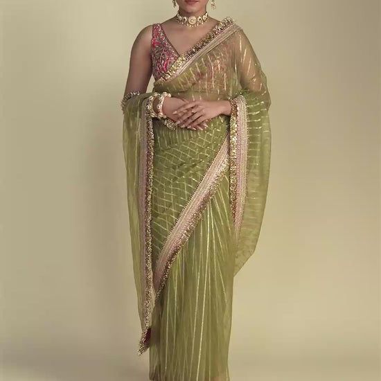 Order now and embrace the captivating elegance of the Noor Sheer Green Saree With Zardozi Embroidered Blouse.
