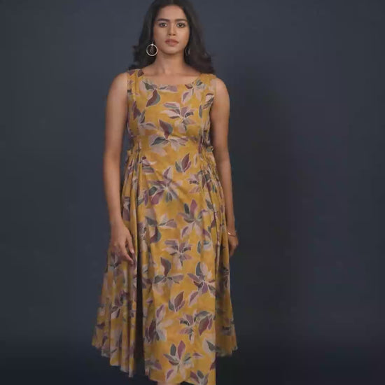 Crafted in a striking ochre color, this midi dress features an exquisite floral print that adds a touch of natural beauty and elegance. The defining detail lies in its hip pleats, meticulously designed to create a beautiful drape and subtle volume, enhancing the feminine form with sophisticated artistry. The midi length offers a versatile and chic appeal, suitable for a variety of occasions.