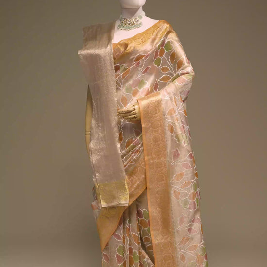 Emphasize the warm ochre color and the charming white florals of this saree by pairing it with delicate gold, pearl, or contemporary white gold jewelry. Subtle stud earrings or a slender chain would beautifully complement the saree's sophisticated aesthetic. Opt for classic nude or metallic heels and a chic, understated clutch to complete your graceful and refined look. This Tissue Silk saree is an impeccable choice for daytime events, elegant brunches, festive gatherings, or any occasion where you wish to combine traditional artistry with a contemporary, refined appeal.