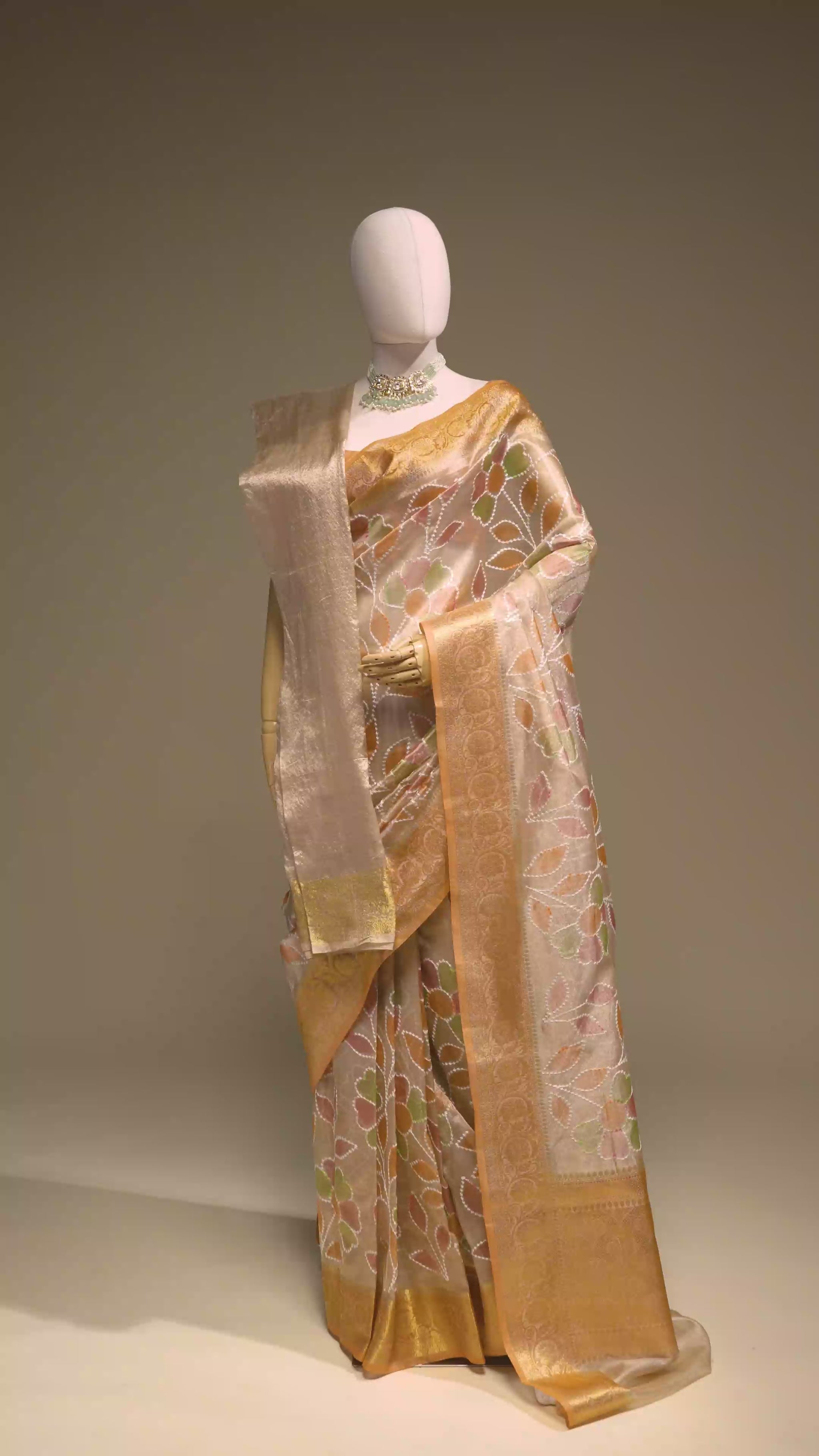Dry Clean Only to preserve the delicate white florals, the luxurious Tissue Silk fabric, and the beautiful ochre color of the saree. Handle with care due to its delicate nature.