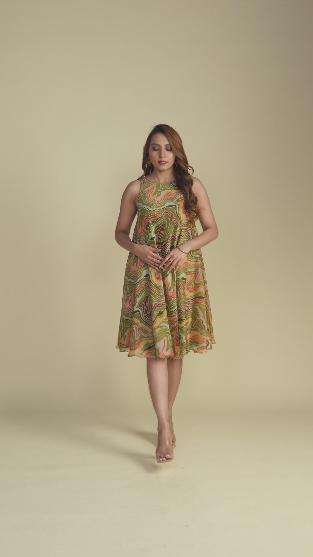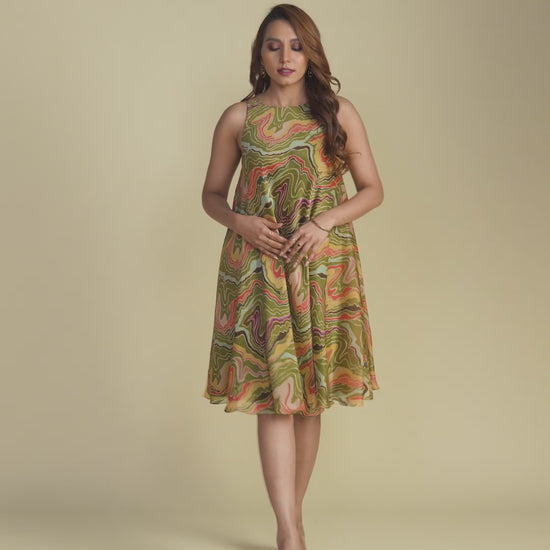 Crafted in a versatile olive green hue, this short dress features a striking geometric print that adds a dynamic and artistic edge to its design. The bold lines and shapes create a visually interesting texture, setting it apart from traditional patterns. The playful mini length makes it an excellent choice for casual yet elevated occasions.